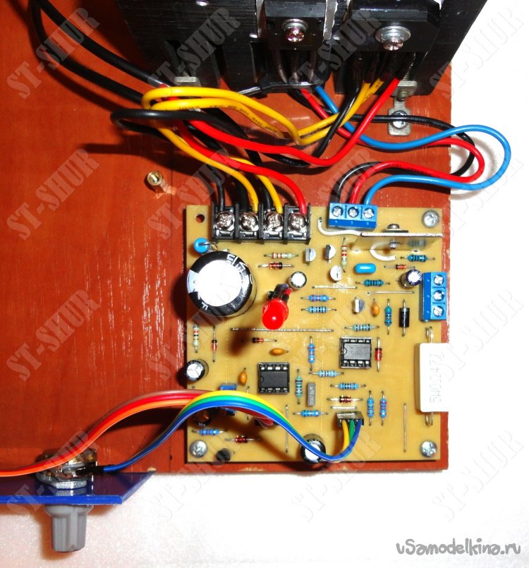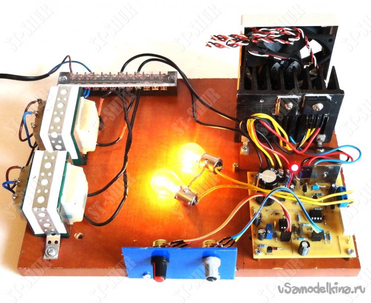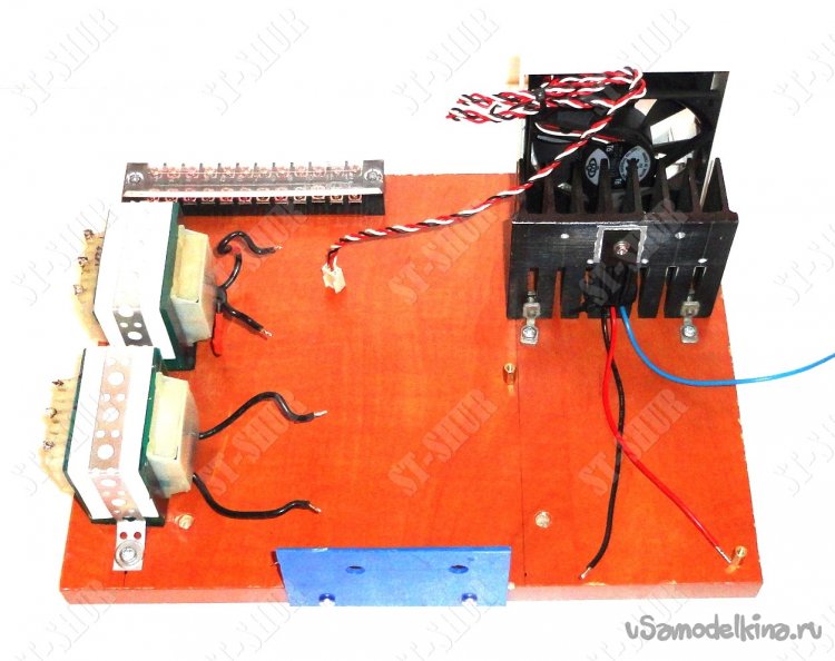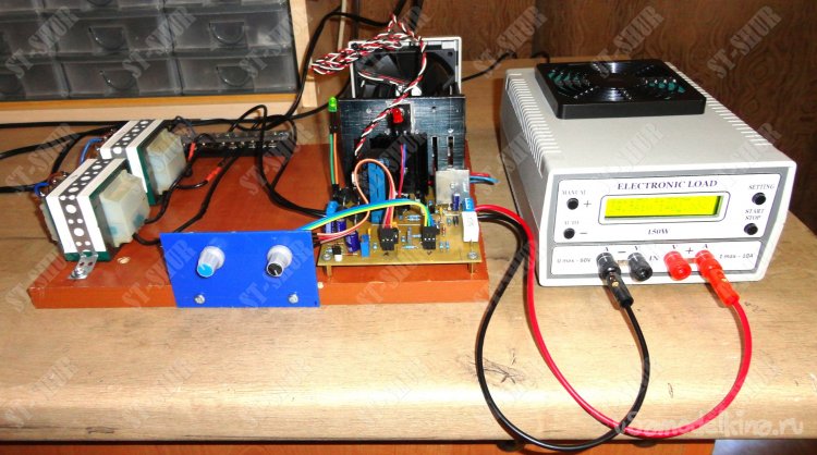 С целью избавиться от «рабочего бардака» на столе, по быстрому на обрезке ЛДСП был «сколочен» своеобразный стенд. На нем были закреплены: имевшиеся в наличии трансформаторы, радиатор, вентилятор, клеммная колодка и держатель для переменных резисторов (с расчетом на возможность использования в будущем).
