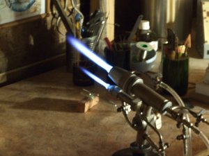 Фото 14. Подключенная горелка на рабочем столе под вытяжкой. Напротив на кубике – еще одна простая настольная маломощная горелка. Встречное пламя облегчает жизнь начинающему стеклодуву.