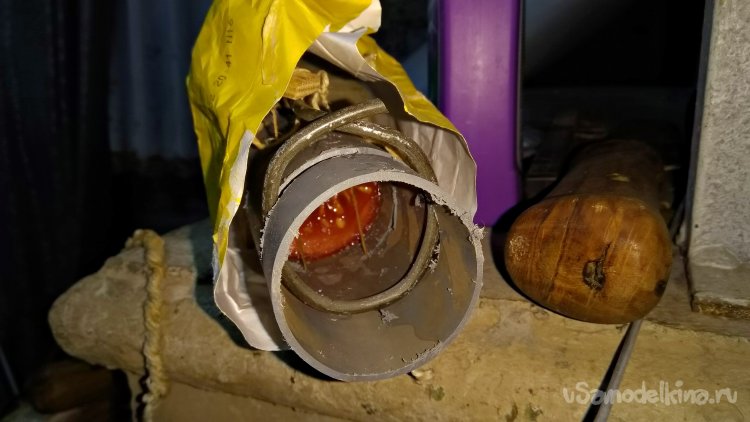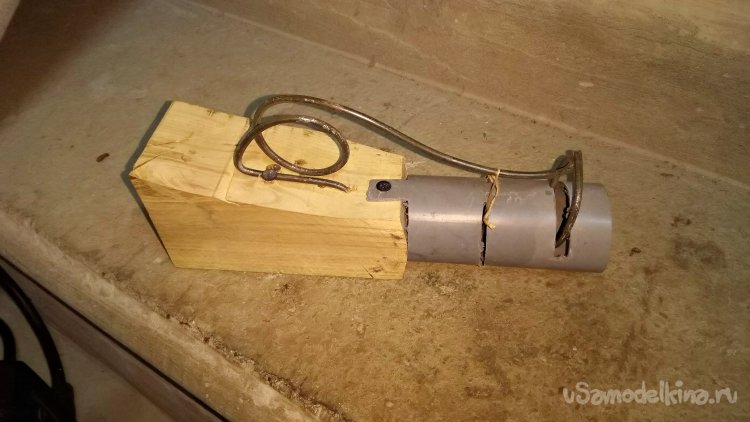 Затруднений с поиском такой проволоки думаю не будет, полное название «проволока стальная для подвеса кабеля», три миллиметра диаметром самое то. Полтора витка загнуть кольцом на болванке миллиметров 20-40. Не критично, как получится, и одно кольцо по размеру трубы, то есть 50 мм. По фотографиям думаю вопросов не возникнет, понятно куда гнуть и как крепить.