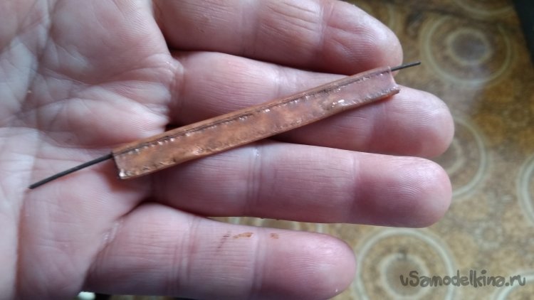 Для создания полотна петли и формирования оси, использовал стальку из корда шины, засунул обрезок проволоки в медную трубку и обстучал так, чтобы проволока оказалась с одного краю по всей длине.