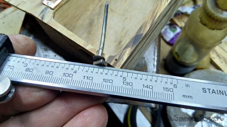 В качестве ответной части защёлки, обычный гвоздь., магнит врезал в крышку. Магнитик плоский и я его вклеил в выборку в углу крышки, напротив в корпусе шкатулки просверлил отверстие. Расширил вверху место под шляпку чтобы вровень встал гвоздь с плоскостью, и забил его в отверстие.