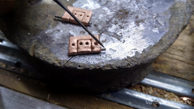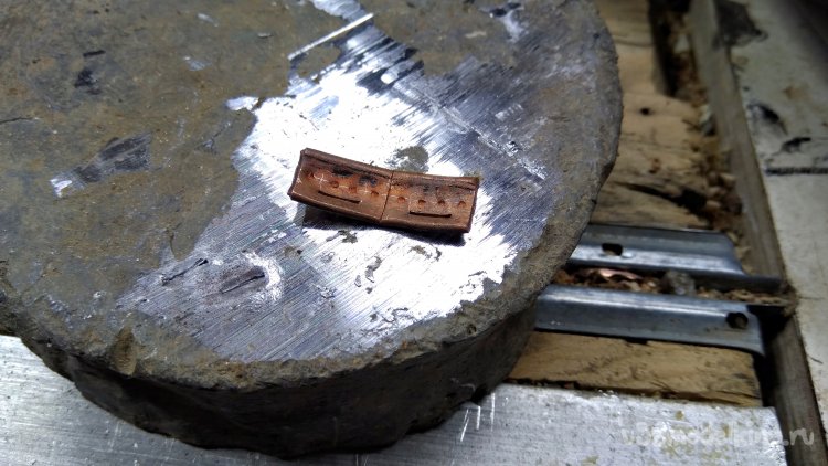 Наковальню использовал свинцовую, можно было конечно и дубовую, но свинцовая случилась ближе. Выбор мягкой наковальни обусловлен тем. Что я буду пробивать отверстия насквозь меди, и упереться твёрдым калёным остриём в не менее твёрдую наковальню грозит порчей и того и другого. Кроме того, и вырубать зубилом петли буду так-же.
