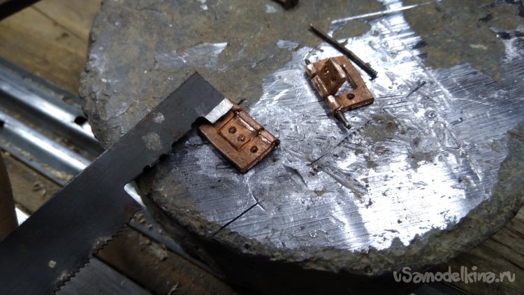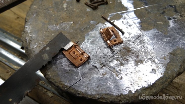 Наконец отрезаю от общей заготовки петли и расклёпываю торцы осей, чтобы не выпали при эксплуатации.