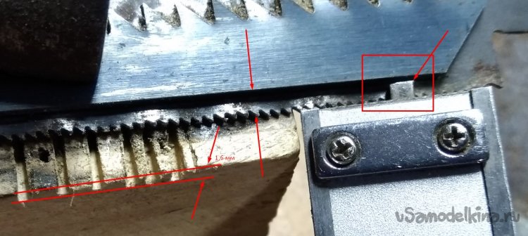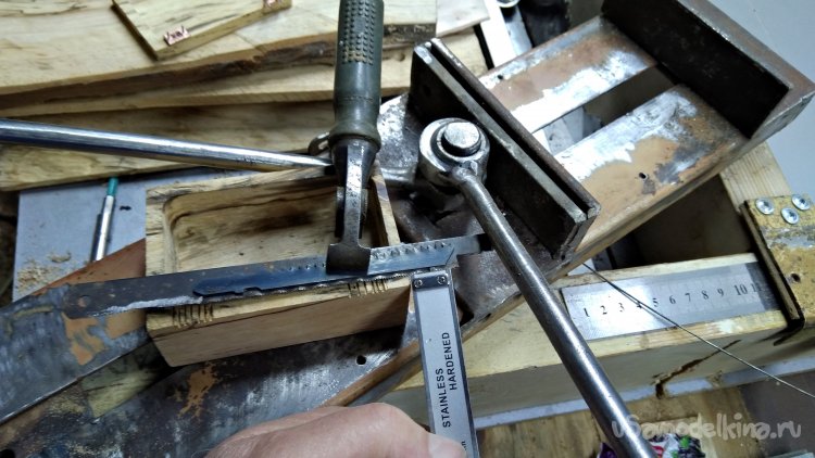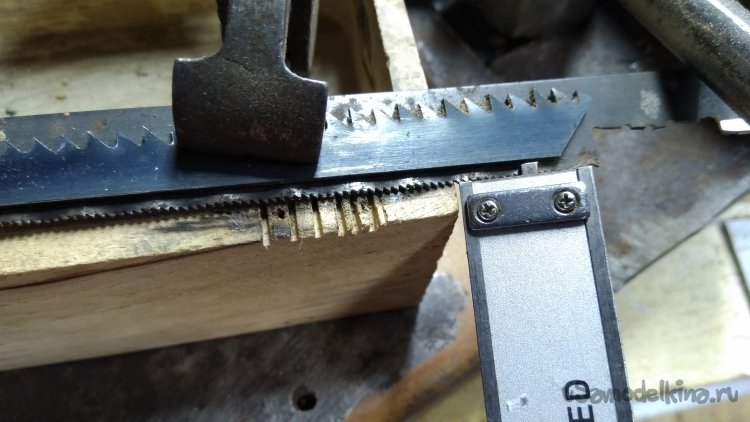 Для ограничения глубины пропила использую нехитрое приспособление, ограничитель временный. На ножовочное полотно прикладываю второе полотно, но обушком, и зажимаю ручными тисочками. Глубина пропила регулируется в соответствии с толщиной петель и контролируется штангенциркулем. После нескольких параллельных пропилов стамеской удаляю оставшиеся гребни.