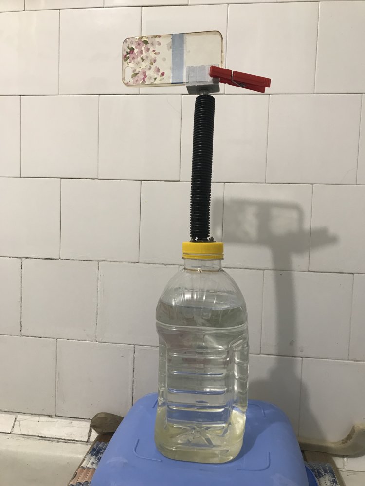 Наливаем в бутылку воду. Это придаст большую устойчивость штативу. Накручиваем крышку с прикреплённым к ней угольником на бутылку. Будущее местоположение прищепок на металлическом угольнике (для лучшего обзора) показано без айфона.