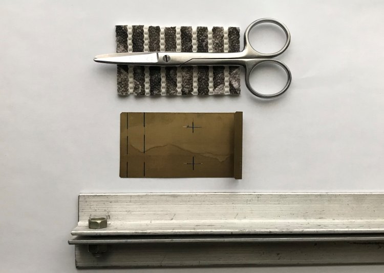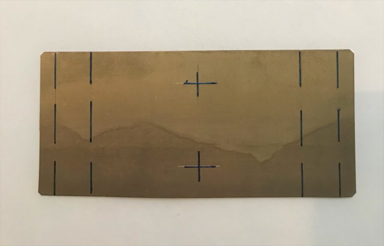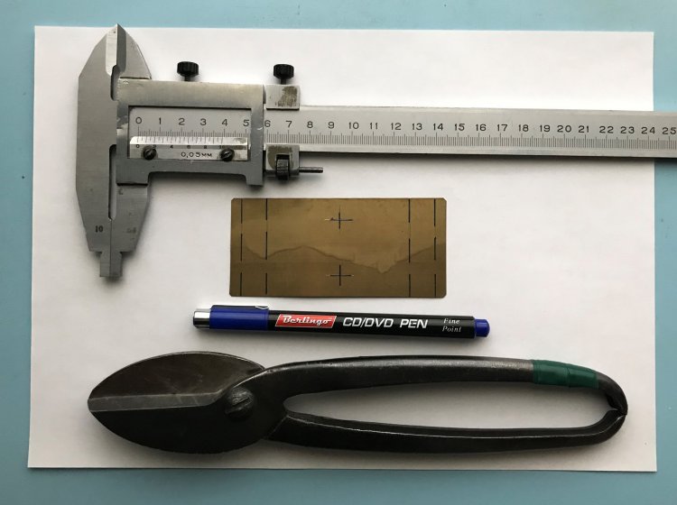 После вырезания заготовки ножницами по металлу и разметки заготовки штангенциркулем (для лучшего просмотра линий изгиба и центров отверстий), разметка обведена тонким синим маркером.