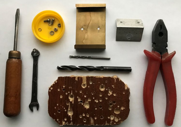 Для изгибания заготовки держателя (изображённой на рисунке 01) из пружинистой бронзы автор использовал ранее изготовленное специальное приспособление, но подойдут также слесарные тиски или даже плоскогубцы.