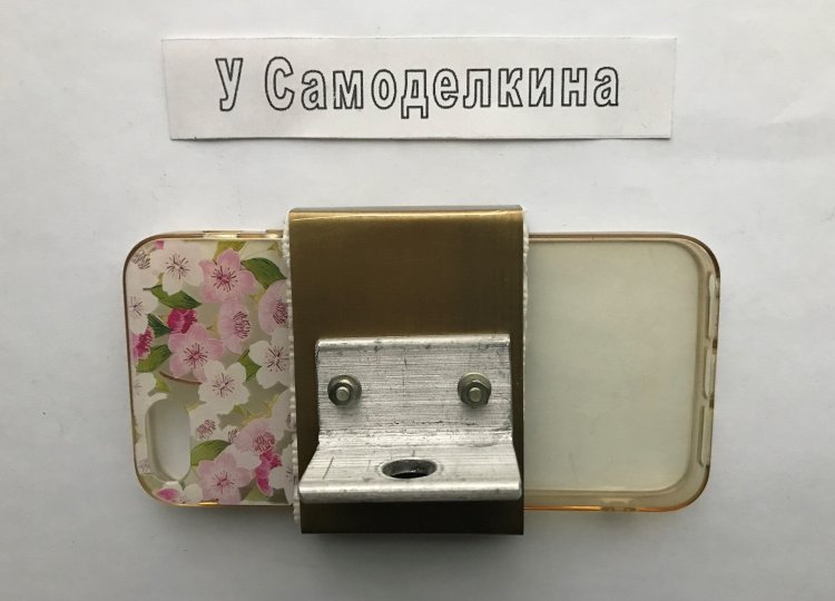 Вид сбоку и сзади (соответственно) на держатель айфона, соединённый двумя винтами М3 с дюралевым угольником. (На этом рисунке и далее вместо айфона показан футляр, так как айфон занят в фотосъёмке.)