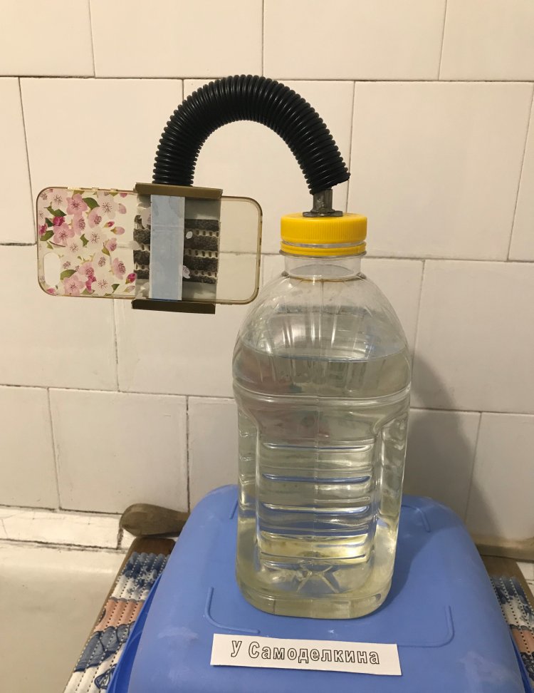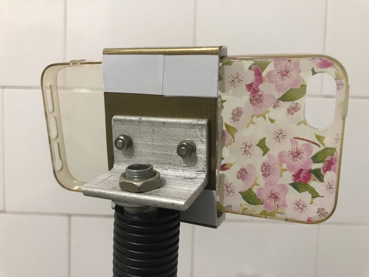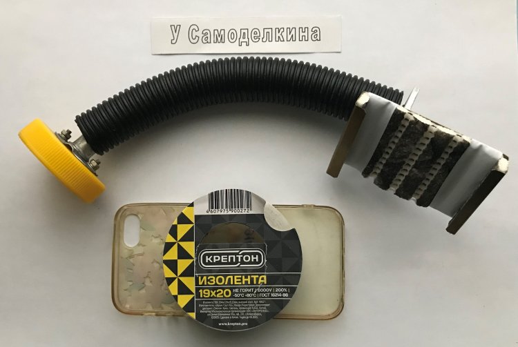 Чёрный армированный гофр соединяет жёлтую крышку от пластмассовой бутыли и держатель айфона. Амортизирующая вкладка, выполненная из душевого коврика, с двух сторон обмотана 1-2 витками белой изоленты.