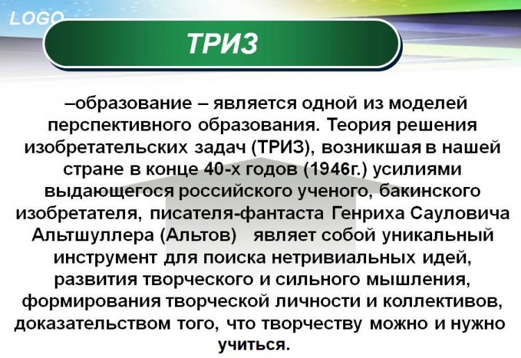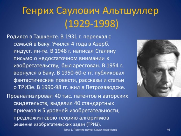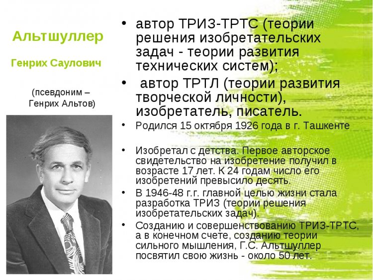 ТРИЗ впервые опубликована в 1956 году. Это технология творчества, основанная на идее о том, что «изобретательское творчество связано с изменением техники, развивающейся по определённым законам», и что «создание новых средств труда должно, независимо от субъективного к этому отношению, подчиняться объективным закономерностям».