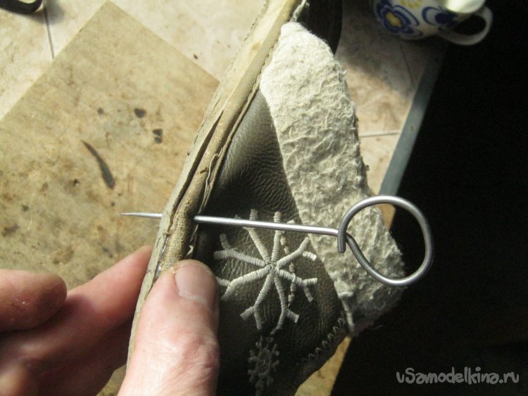 Работа обувным крючком несложна хотя и своеобразна. Особый шов, этакое плетение, позволяет действовать преимущественно с одной стороны – большое достоинство при ремонте обуви, и сильно стягивать обе сшиваемые детали. Плюс, возможность использования солидной нитки или даже нетолстой веревочки и возможность проколоть толстые детали. Итак.