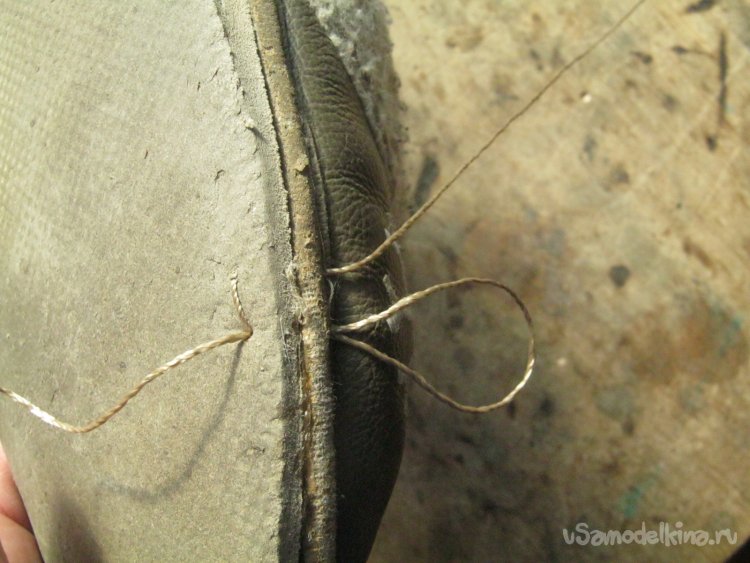 Фото 4. Начало шва. Шилом-крючком протягиваем через прокол отрезанный от катушки и сложенный петлей кусок нитки.