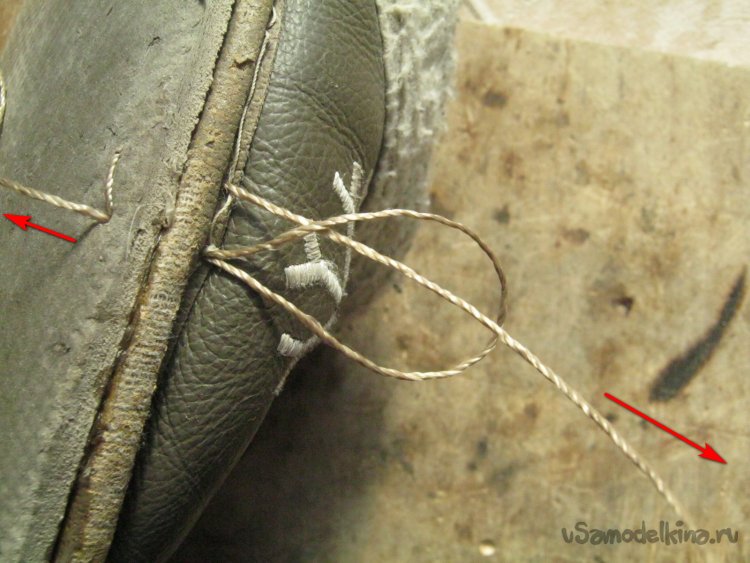 Фото 8. С лицевой стороны башмака свободный конец нитки пропускаем в петлю и взявшись с двух сторон (стрелки) затягиваем узел. Снова получаем исходное положение (Фото 5) – два прямых конца с разных сторон. Повторяем операции. В конце шва обе нитки лучше вывести на лицевую сторону и завязать хирургическим узлом или, на узел обычный двойной, нанести капельку клея.