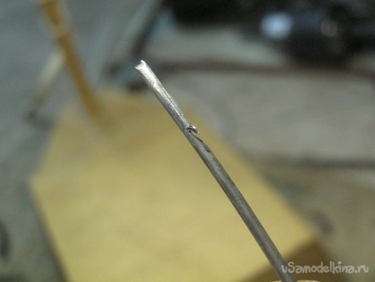 Фото 17. Стеклянная замазка, при всех ее достоинствах, менее липкая, чем синтетические клеи – невеликую гладкую металлическую поверхность при значительных нагрузках ей не удержать. Отожженный для мягкости проволочный хвост зачистил крупной наждачкой и сформовал в плоскую петлю.