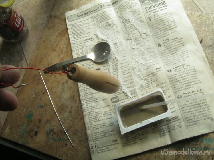Фото 16. Готовая отделанная ручка для шила. Видно удобное крепление-подвес для лакирования – длинный саморез слегка ввинченный в дно отверстия и проволочный крючок. В пластиковом корытце приготовлен любимый состав для замуровывания – стеклянная пыль с жидким стеклом.