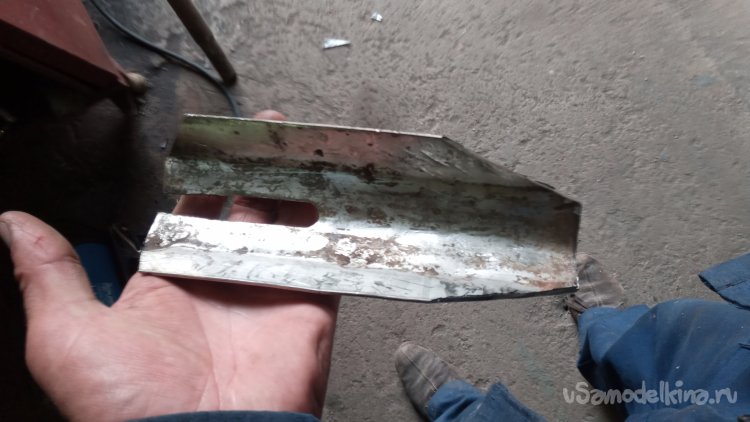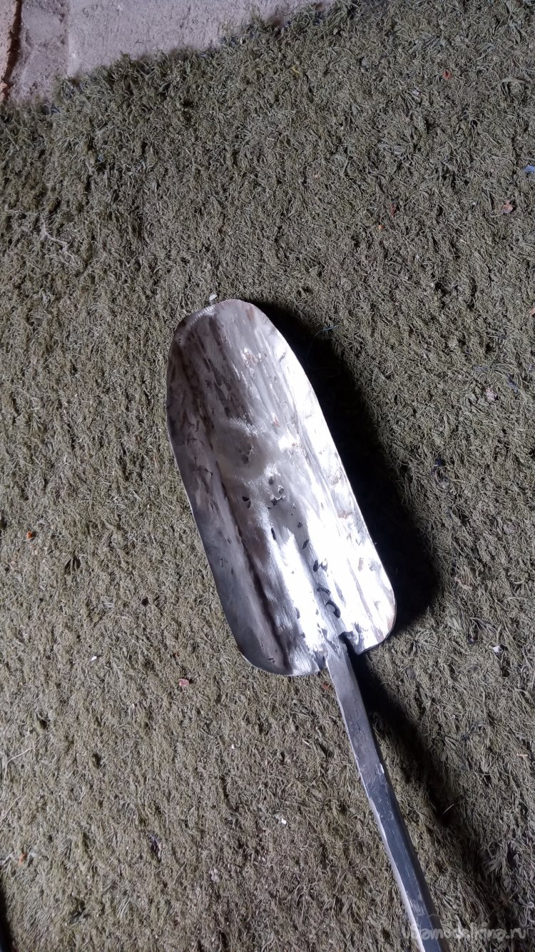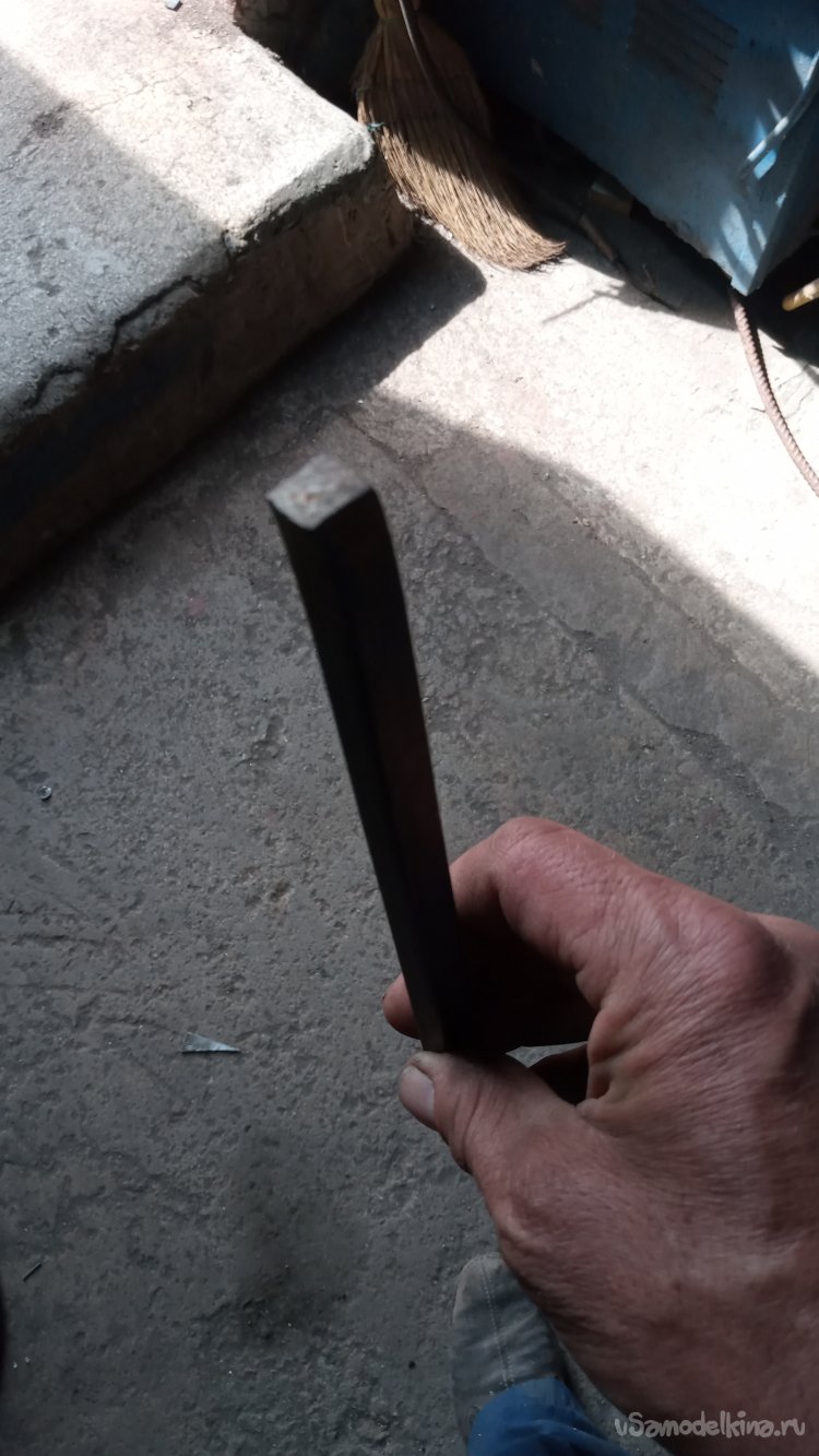 Вот его и решил использовать. Его необходимо вварить хотя-бы на треть длины, чтобы он защищал штык от сгибания в месте, к которому прилагаются на излом наибольшие силы. Да и, ближе к носику, штык будет сильнее вогнут, что обеспечит ребро жёсткости, а вот, верхняя часть более плоская. В покупной лопатке пруток был приварен поверху, "внахлёст". Но там он меньшего сечения. У меня нет подходящего прутка из нержавеющей, или инструментальной стали. А из обычной "сыромятины" такой тонкий будет сгибаться. Так что, выход один - использовать этот квадрат (его сечение позволит выдержать нагрузки) и расположить его "более обтекаемо", то есть, не приварить поверху, а заглубить в плоскость.