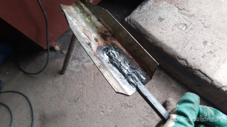 На следующий день, в обеденный перерыв, (чтобы не мешать никому),я пошёл в мастерскую, включил сварку и приступил к ремонту. Выяснилось, что нет электродов по нержавейке. Но, внимательно осмотрев "окурок", оставшийся в держаке, я понял, что половинка нужного электрода у меня, таки, есть.))) И, как это часто бывает, приварив отвалившуюся рукоятку, "зацепился за тему". Подумал, что, будь под рукой подходящий материал, ничего не стоило бы сварить ещё один такой-же совок. Материал подходящий (хоть и не совсем такой, как хотелось) нашёлся в мастерской, в груде обрезков. Так на свет появился ещё один крепкий садовый совок.)))