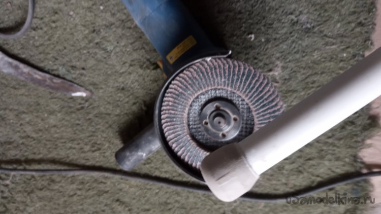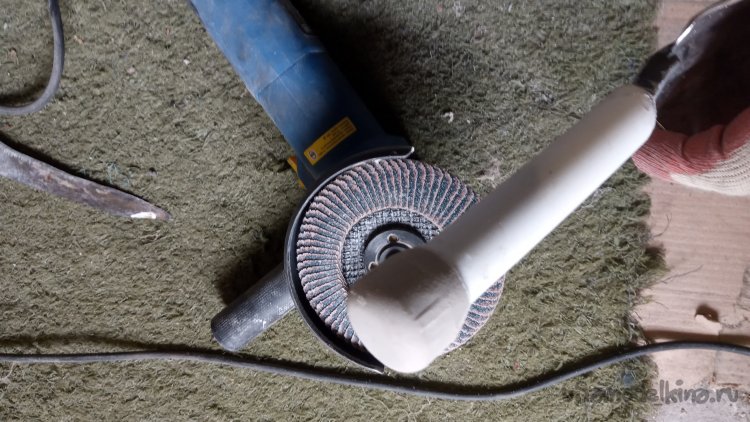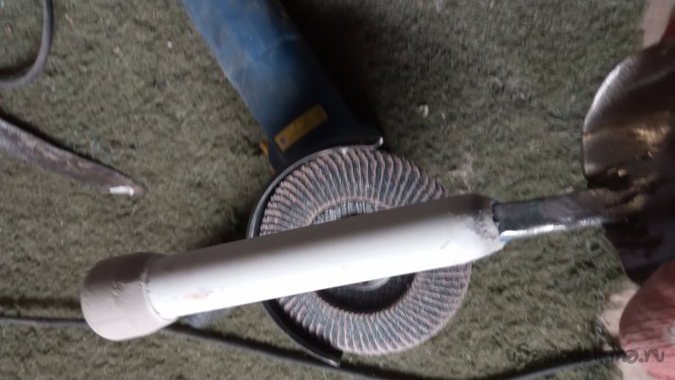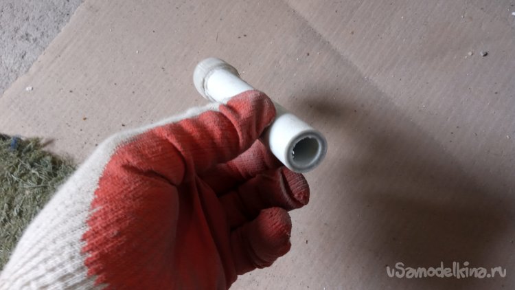 Теперь рукоятка. Уже было хотел использовать многократно обкатанный метод - обложить в несколько слоёв отрезками распущенного вдоль пластикового армированного поливочного шланга и обмотать изолентой. Но попался на глаза обрезок полипропиленовой трубы - "двадцатки" с приваренной заглушкой:
