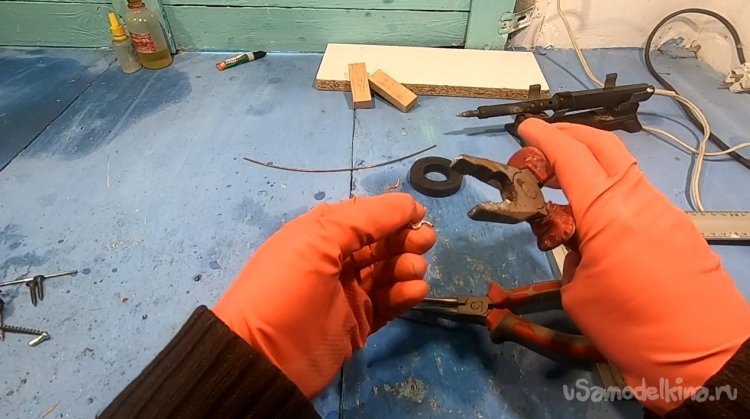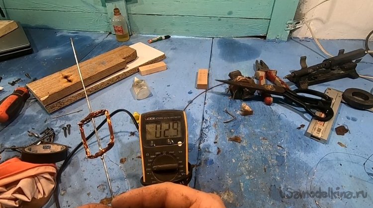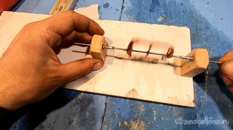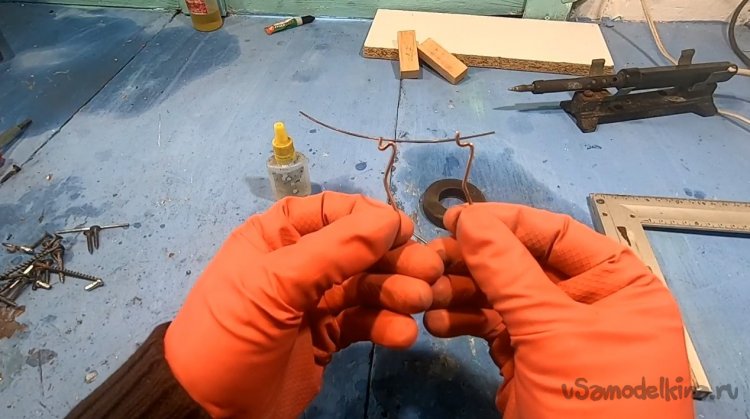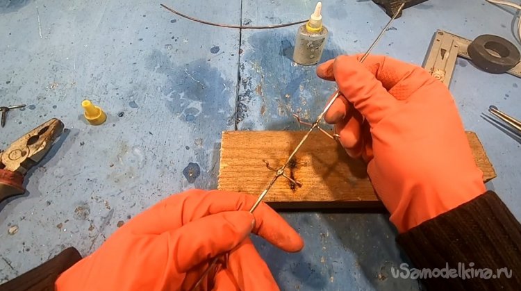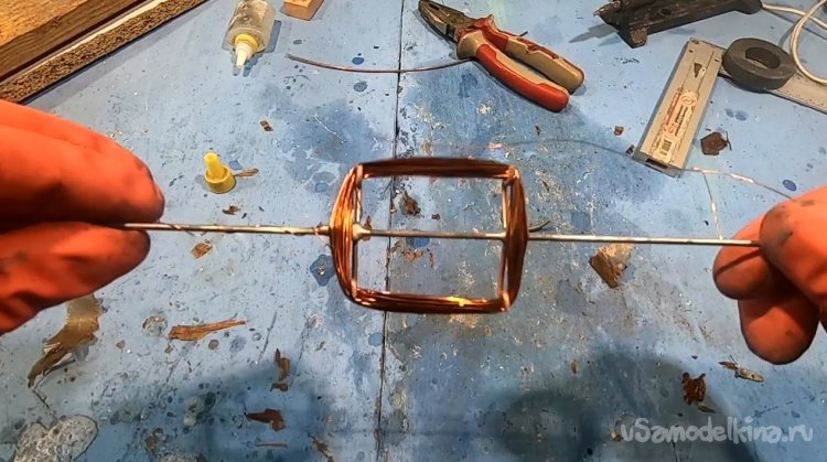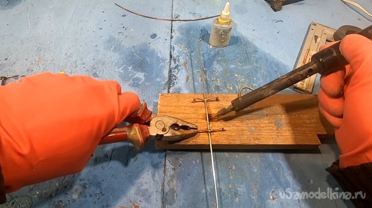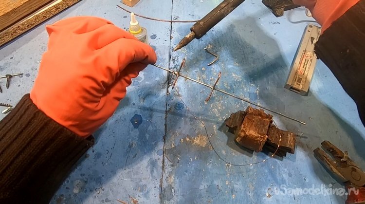 Делаем основу для наматывания катушки, для этого из медной проволоки выгибаем такие своего рода плечи. Далее эти плечи припаиваем к спице.