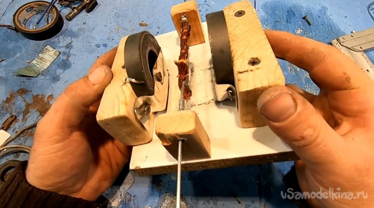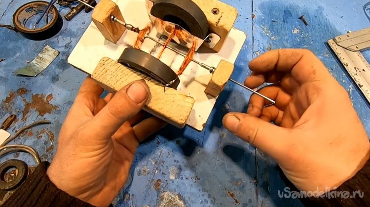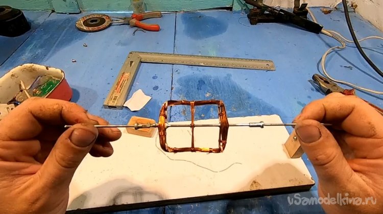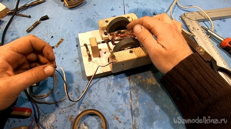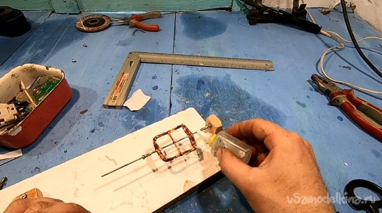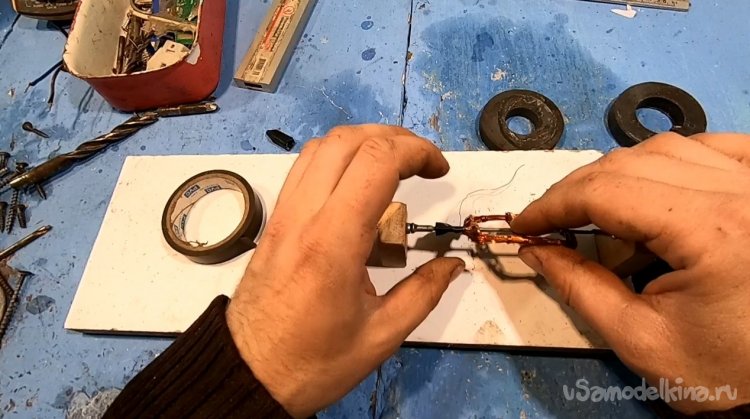 Катушку укрепляем тем же проводом, приматываем к основе, а также стягиваем между собой. Если этого не сделать, при высоких оборотах обмотку растреплет центробежная сила.