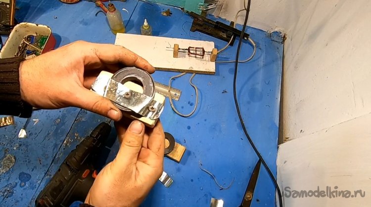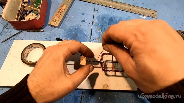 Теперь нам нужно сделать коммутацию, контакт должен прерываться, чтобы катушка провернулась на нужный градус. Снова мотаем изоленту и прорезаем окно.