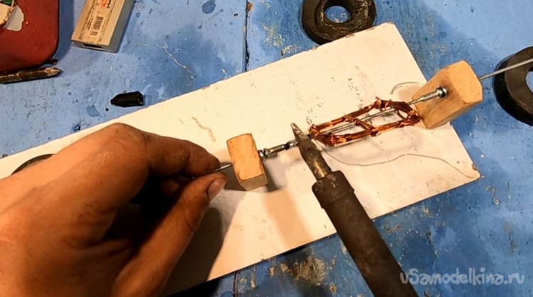 Одна часть коллектора - это ось якоря, а вторую нужно сделать. Намотал изоленты, сверху немного проволоки и пропаял, получился вот такой коллектор, к нему припаиваем второй конец катушки.