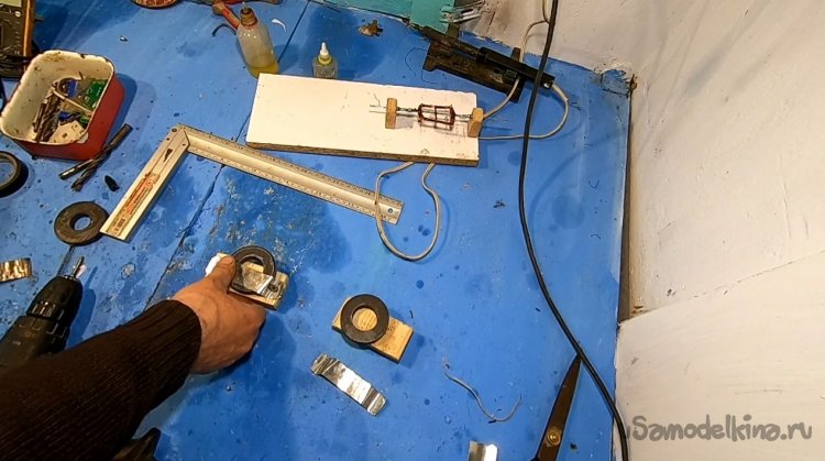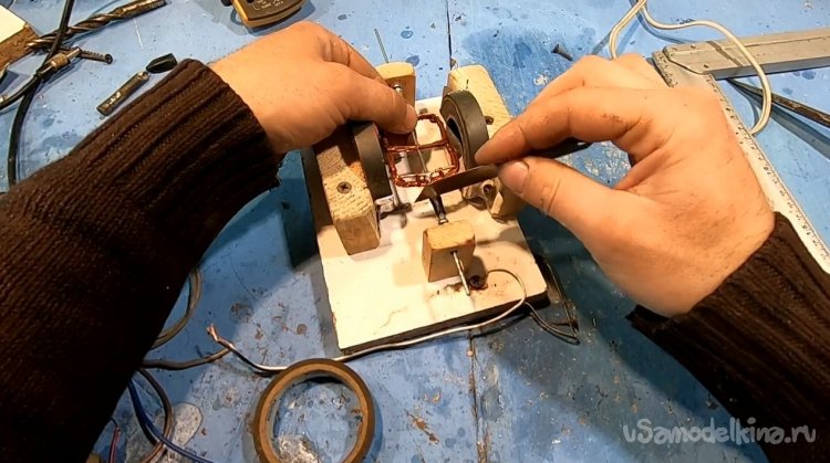Для мотора обязательно нужны магниты, берем от старого динамика, прикручиваем к досками саморезами и крепим к основе, стараясь выдержать минимальный зазор между магнитом и якорем.