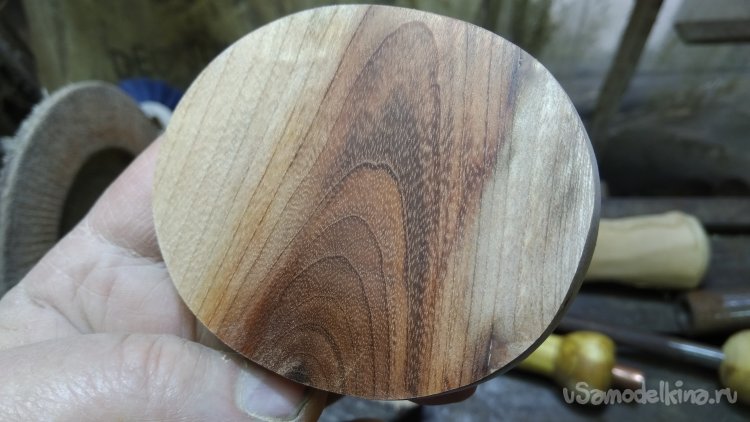 После шлифовки полирую текстильным диском. Это просто много слоёв ткани, сшитых вместе, очень хорошо вычищает из дерева мельчайшую пыль и остатки абразива.