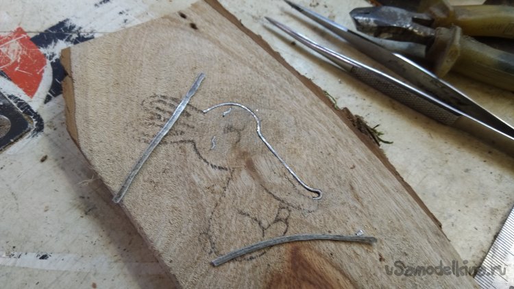 То есть получаются полоски примерно 0,8 мм толщины, 1,6 мм ширины, клиновидной формы и с заплечиками по краям. Верхние заплечики сошлифуются, а нижние, которыми мы вгоним в дерево, помогут там держаться этим полоскам.