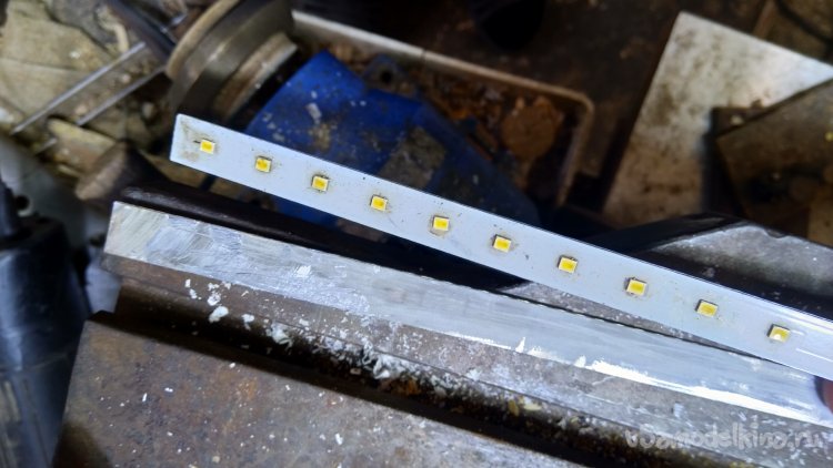 Увы, ничего подходящего не нашлось, решил сделать из того, что есть. Взгляд упал на светодиодные светильники. Радиаторы для них выполнены из алюминия, полоски миллиметровой толщины и ширины в сантиметр примерно. Печатная плата со светодиодами приклеена эпоксидным клеем, я его просто отскоблил ножом.