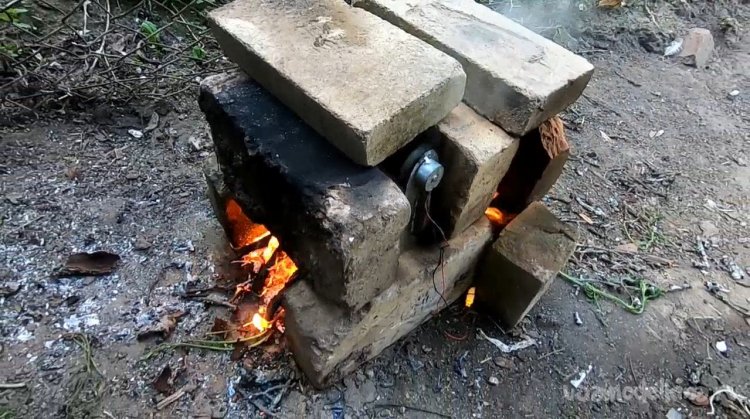 Сконструировал мини-печь из кирпича, разжег дрова, турбинка крутится резво. Даже раздувая огонь воздуходувкой, ничего страшного не случилось, на котле даже не выровняло давлением вмятины. Так что раскалять его можно значительно сильнее, не боясь, что он взорвется. А конкретно такую небольшую печь можно топить и не бояться, что котел взорвется, для этого физически не хватит температуры.