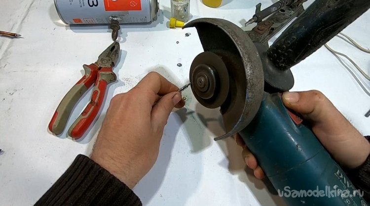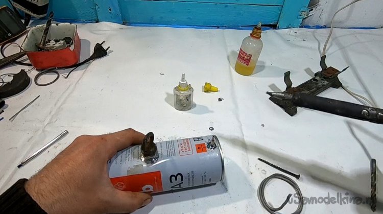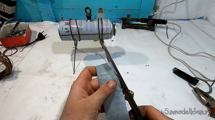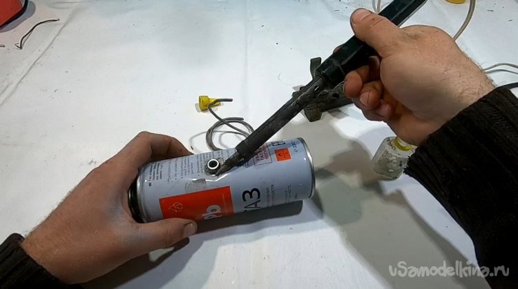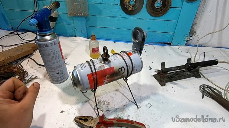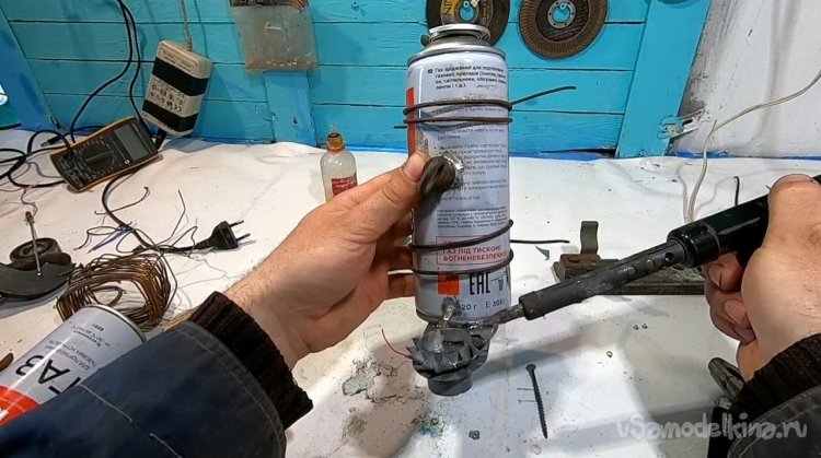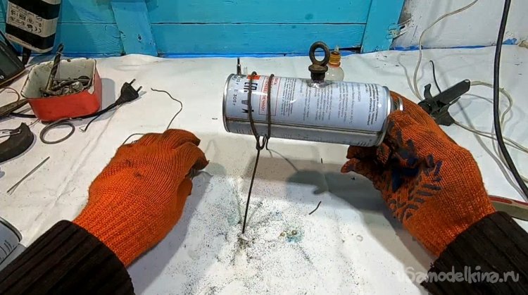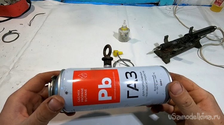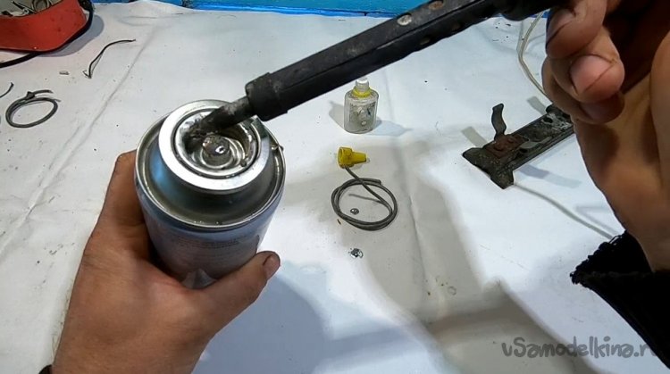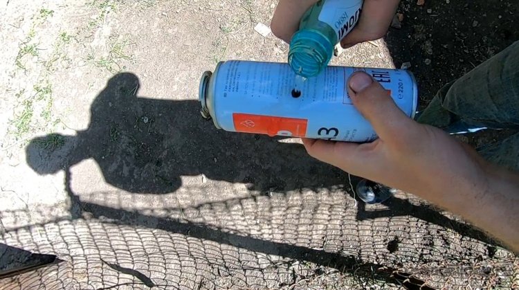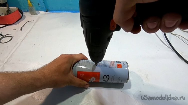 Баллончик я использовал из под газа, работать с ним лучше вдали от открытого источника огня. Сверлим отверстие на небольших оборотах, вырываем плоскогубцами сосок, а потом промываем баллон водой. Вот и все, теперь работать с баллончиком вполне безопасно.