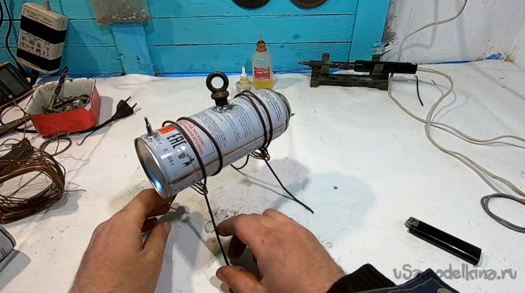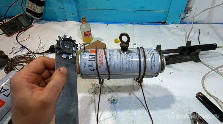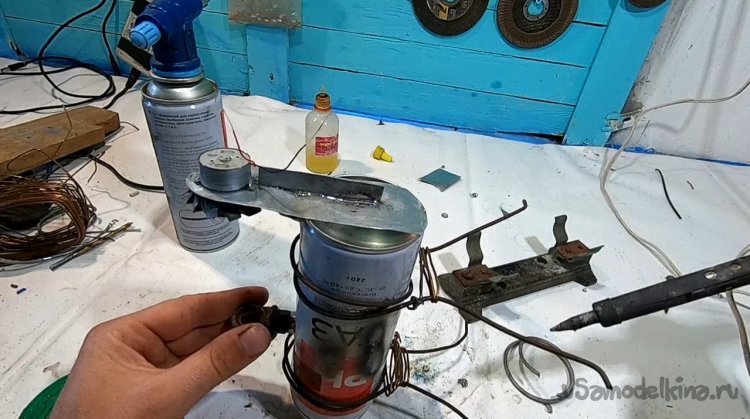 Мотор с установленной крыльчаткой теперь можно установить на баллончик, сопло должно «дуть» на крыльчатку.