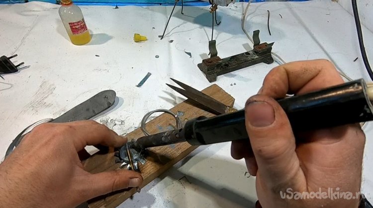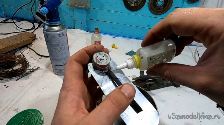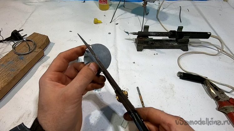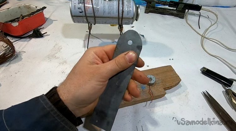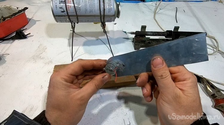Вырезаем из оцинковки пластину и сверлим отверстие. Теперь осталось быстро припаять моторчик, стараясь не перегревать корпус.