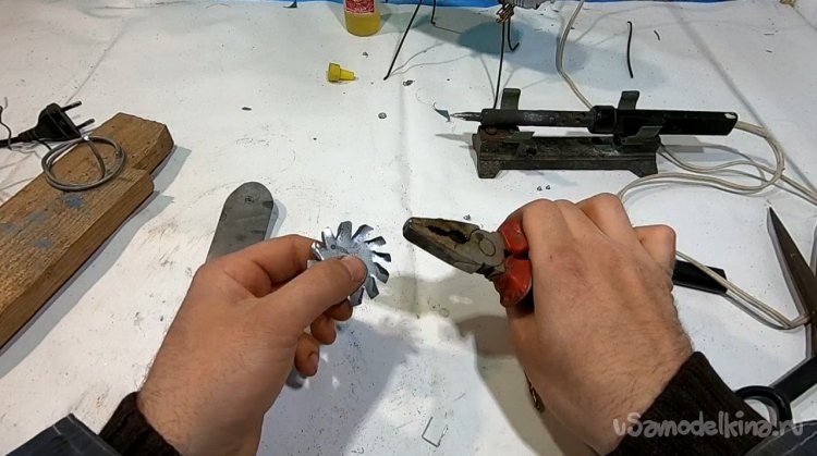 Делаем крыльчатку, вырезаем из жести круг, тут понадобится циркуль. Далее вырезаем и загибаем лопасти. Внутрь впаял кольцо и снова загнул лопасти, чтобы крыльчатка лучше «ловила исходящий пар».