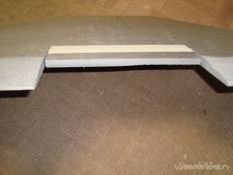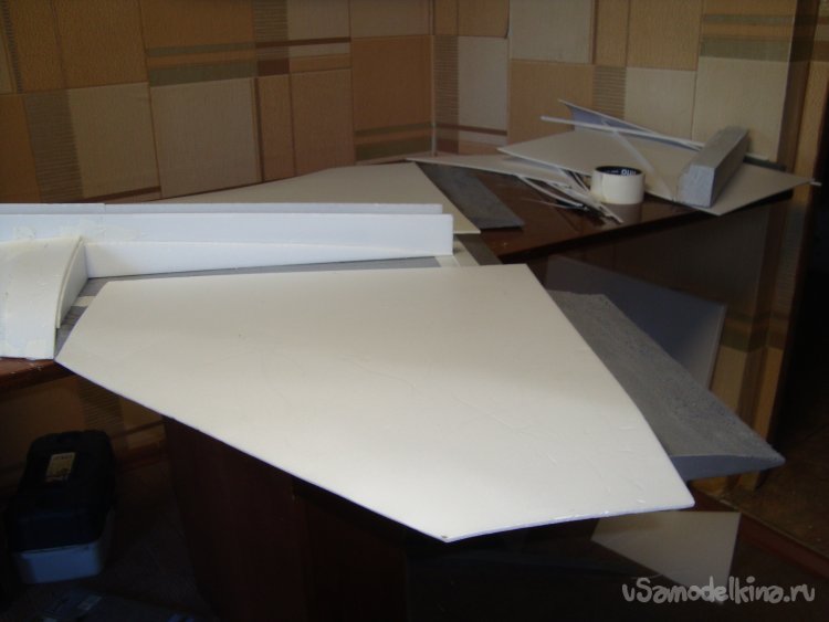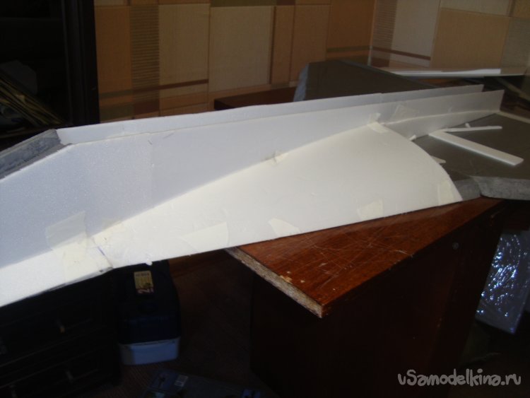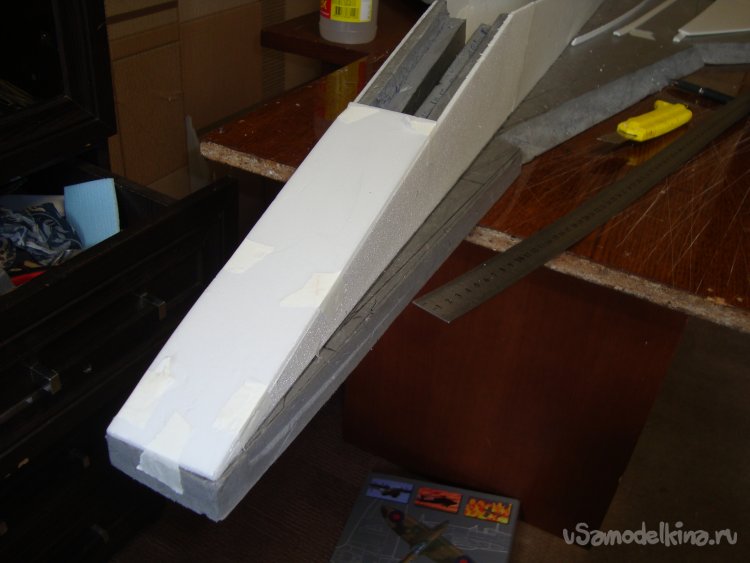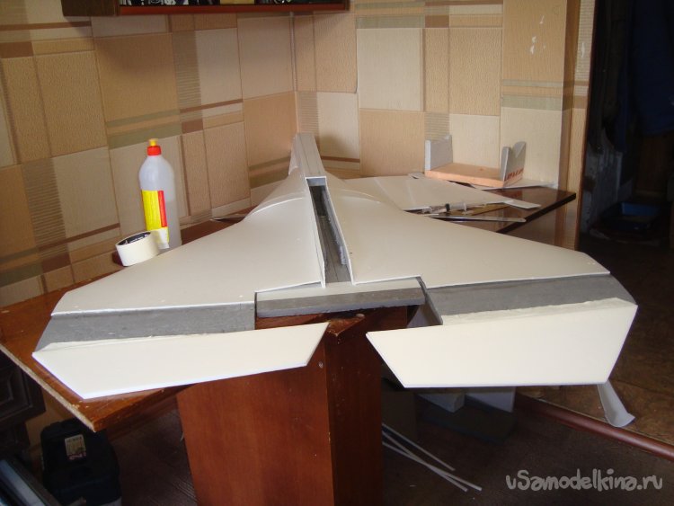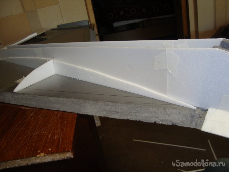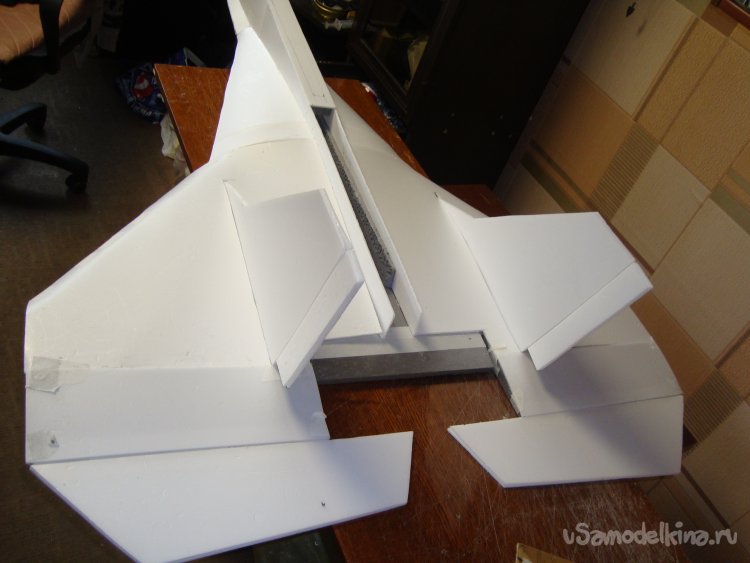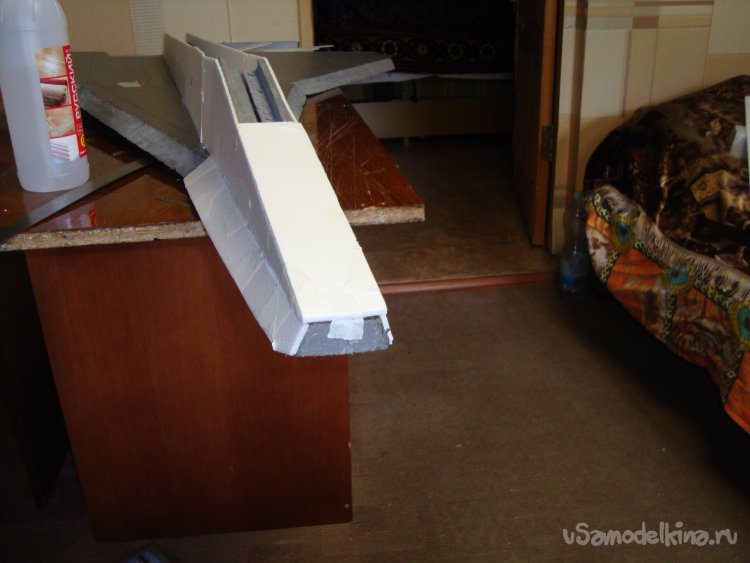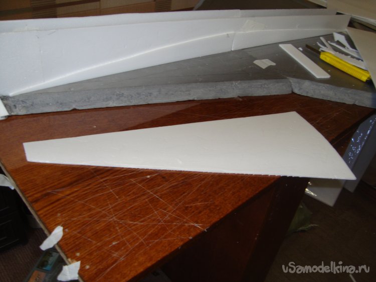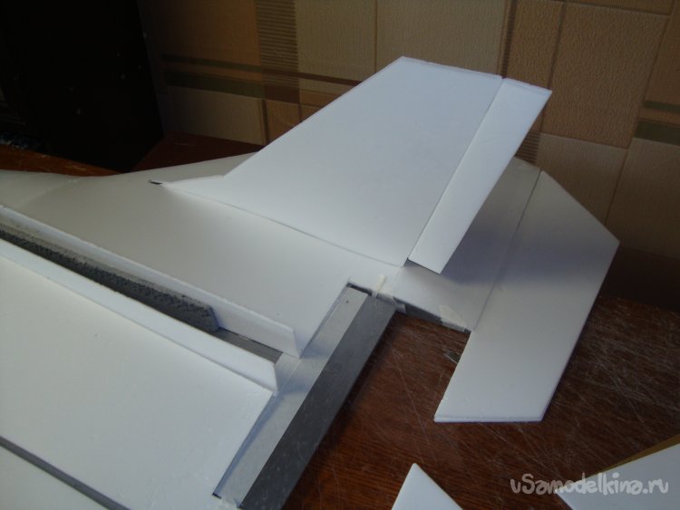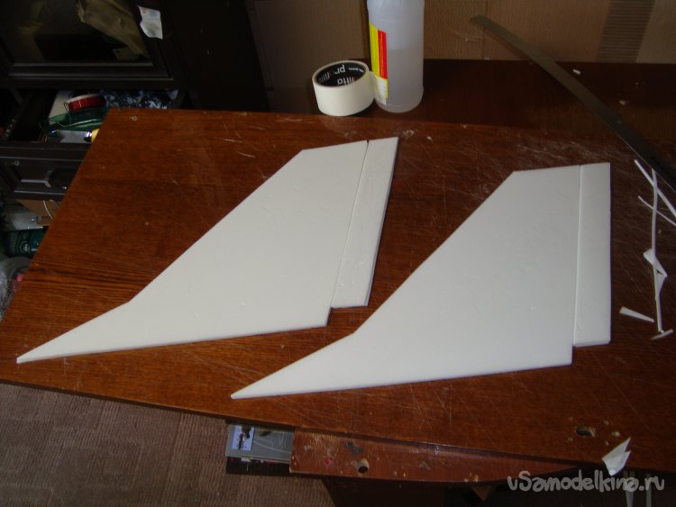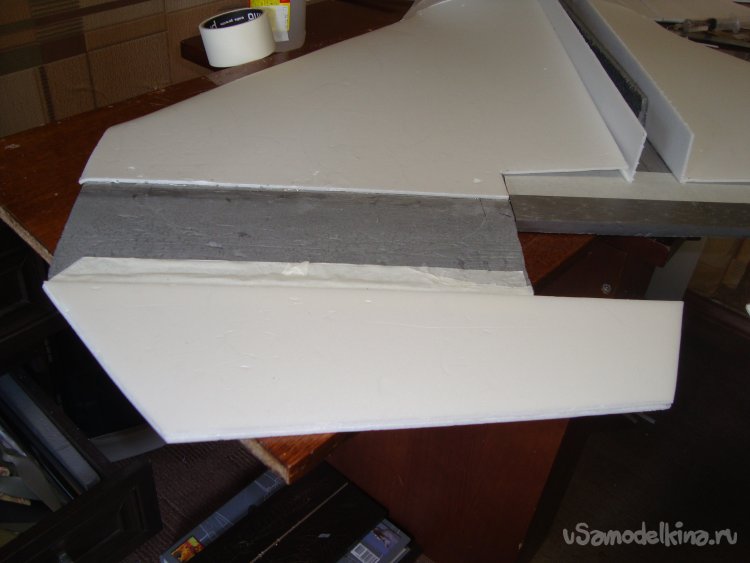 Но после недолгих размышлений решил немного изменить конструкцию модели и вместо руля высоты сделать УВТ по высоте. Для этого срезал лишнюю часть утеплителя и навесил руль высоты, на который в дальнейшем будет крепиться мотор.. РВ навесил на бумажный, малярный скотч. Но об этом расскажу позже.