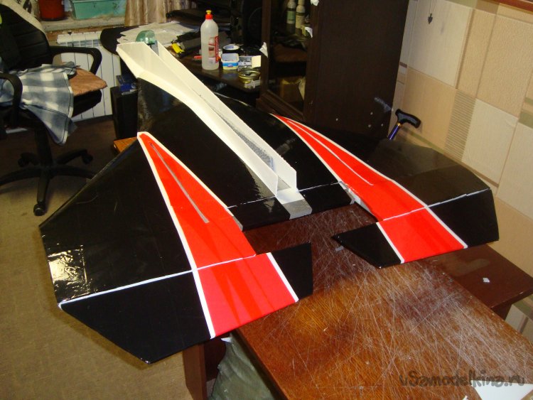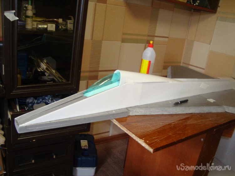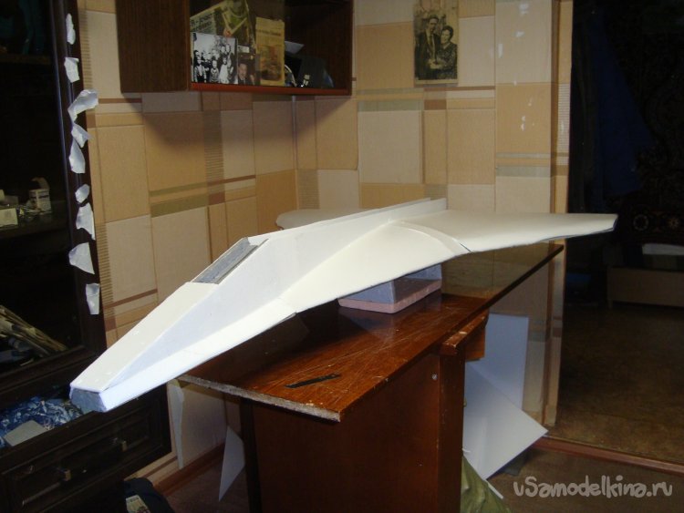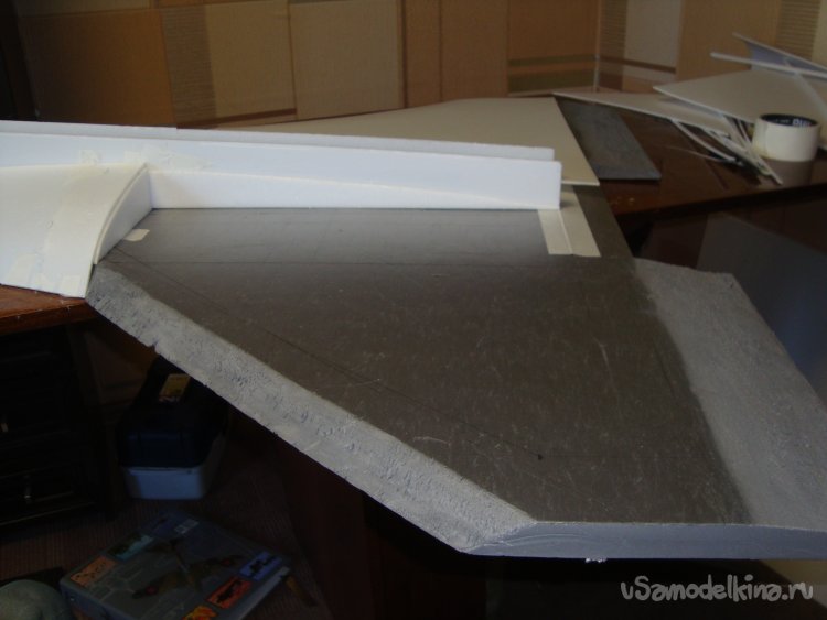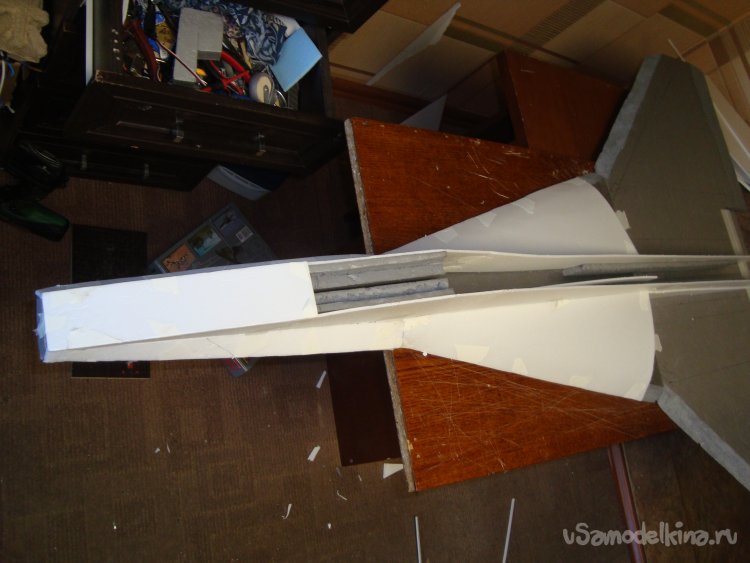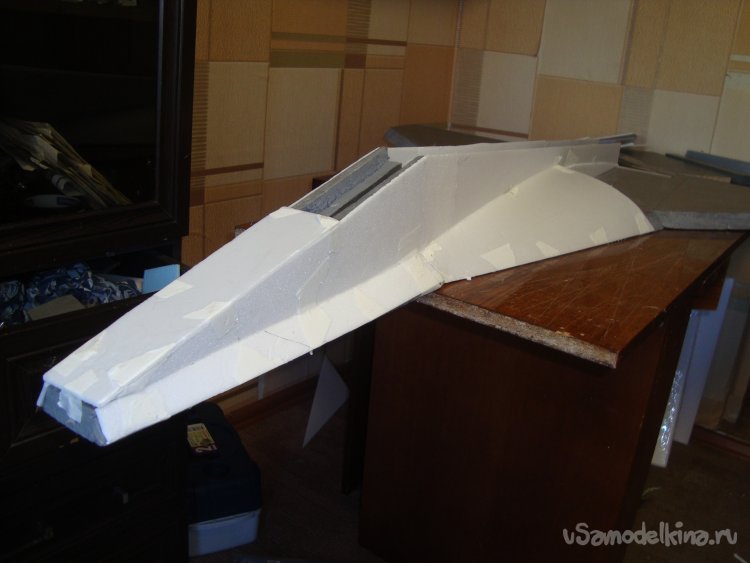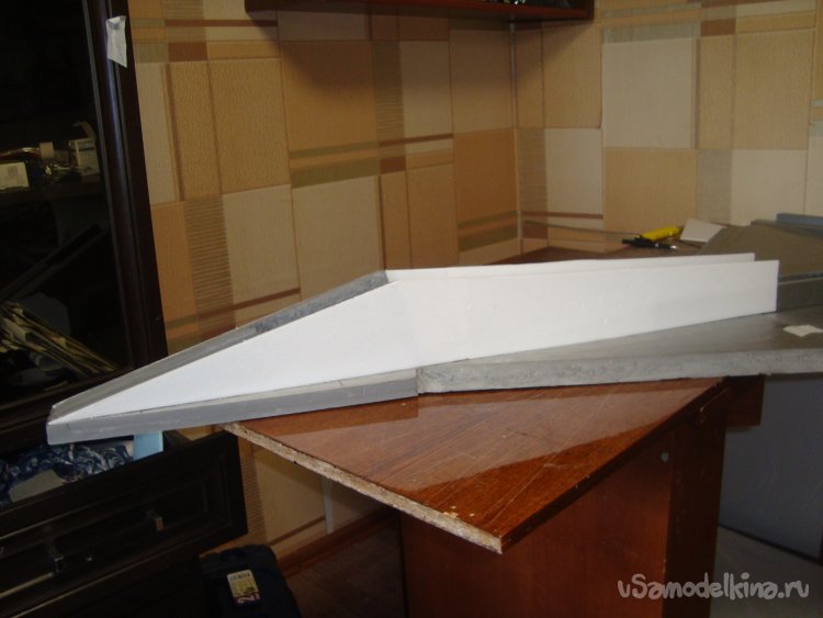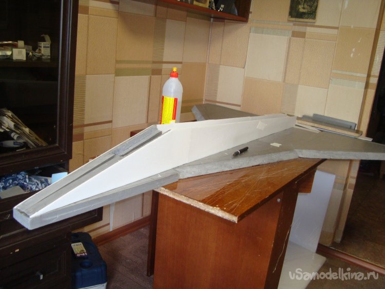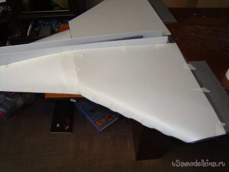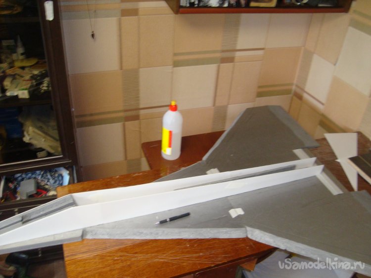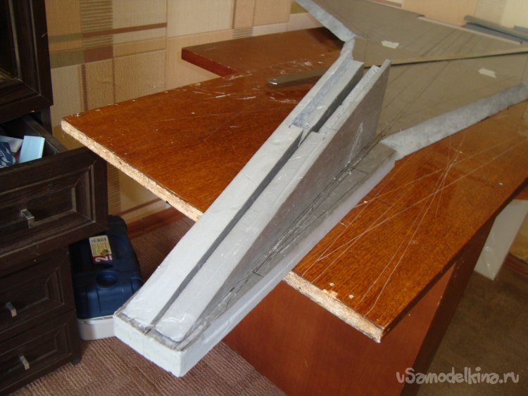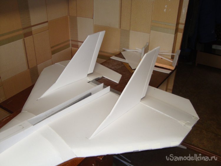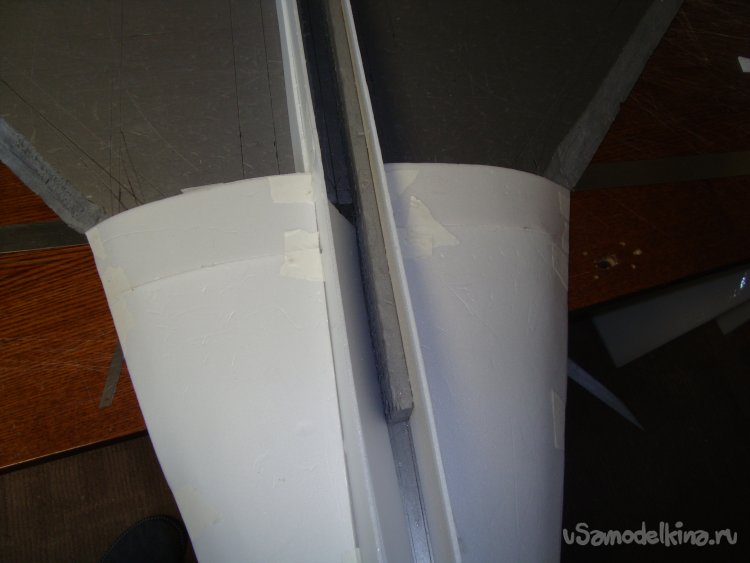 Но после недолгих размышлений решил немного изменить конструкцию модели и вместо руля высоты сделать УВТ по высоте. Для этого срезал лишнюю часть утеплителя и навесил руль высоты, на который в дальнейшем будет крепиться мотор.. РВ навесил на бумажный, малярный скотч. Но об этом расскажу позже.