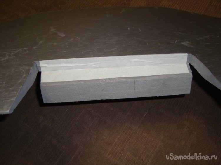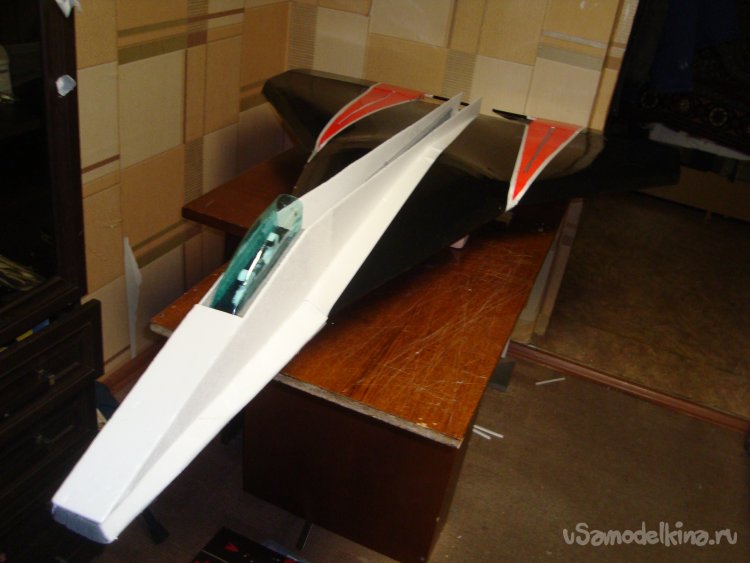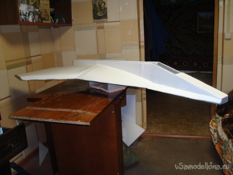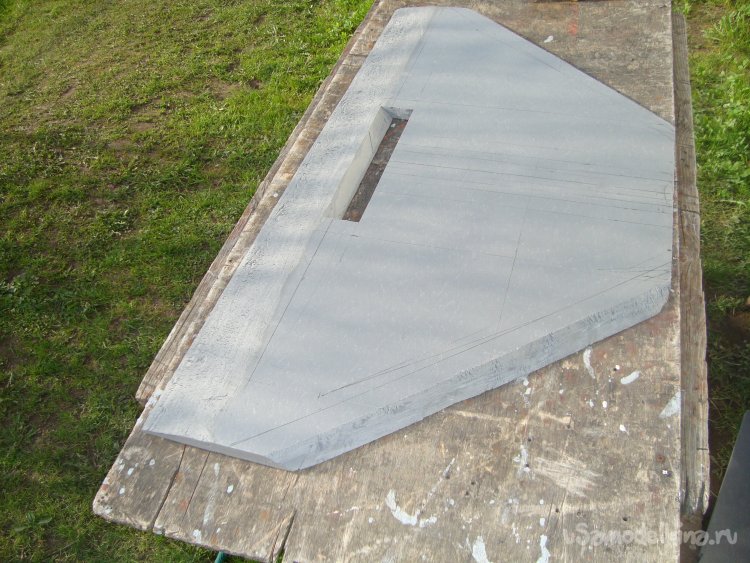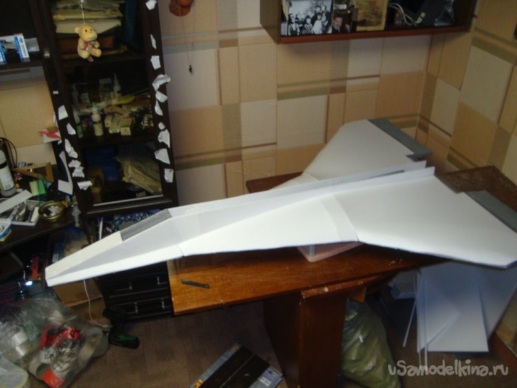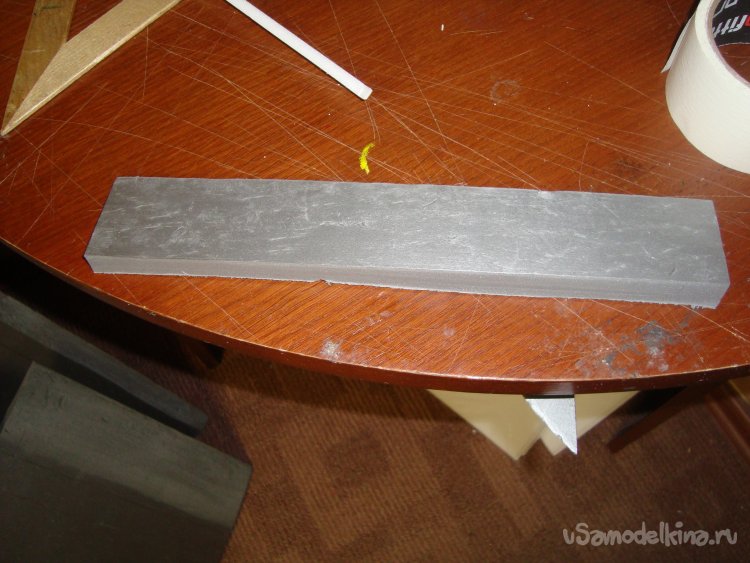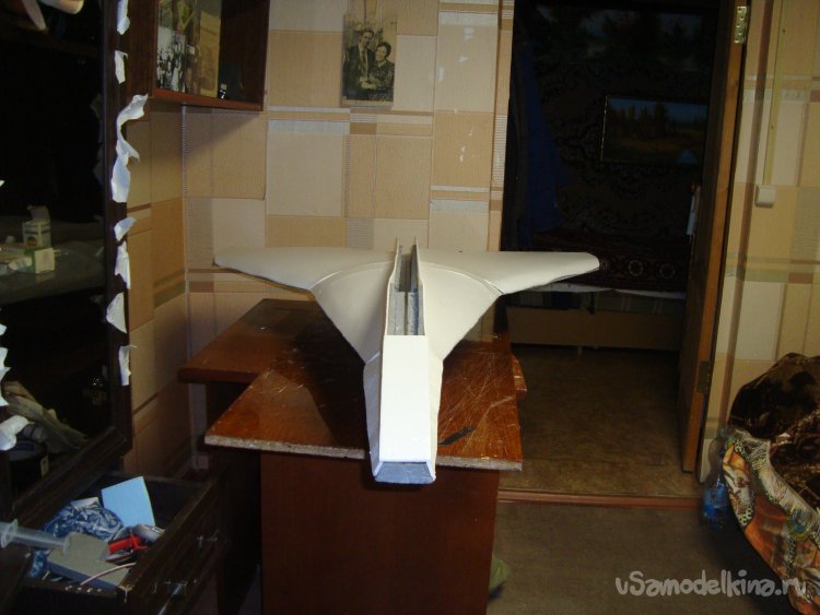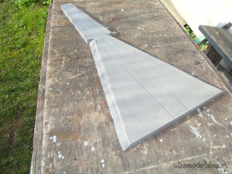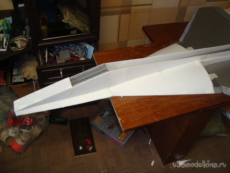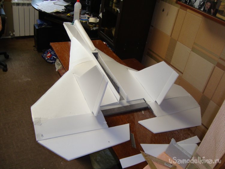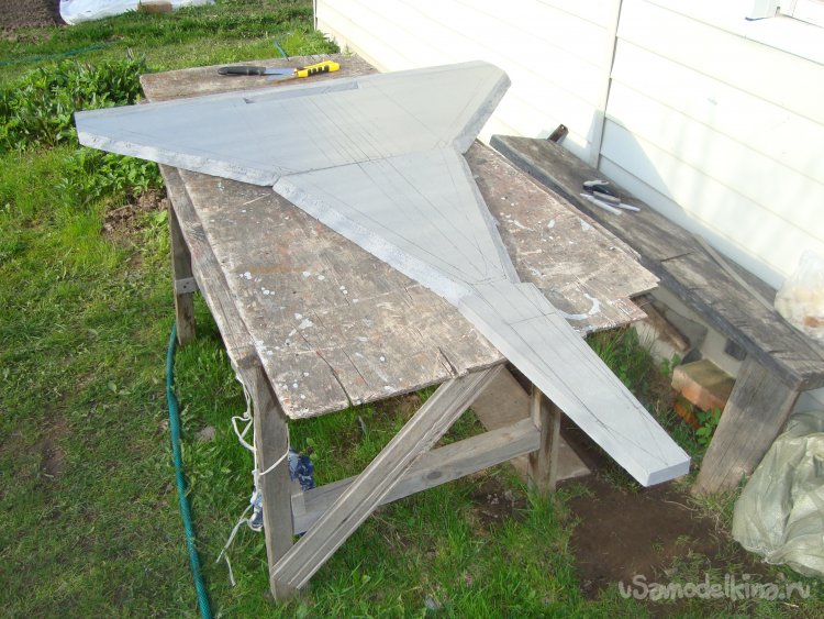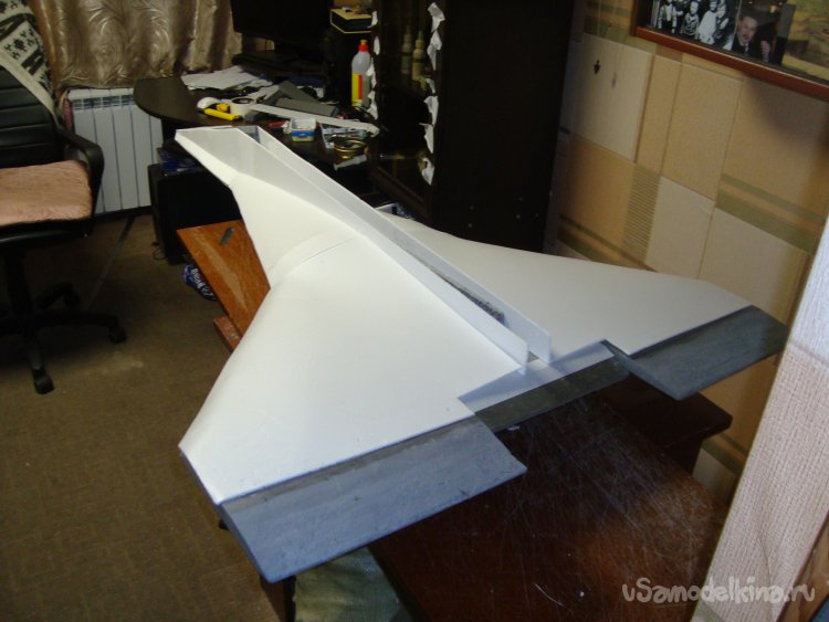 Но после недолгих размышлений решил немного изменить конструкцию модели и вместо руля высоты сделать УВТ по высоте. Для этого срезал лишнюю часть утеплителя и навесил руль высоты, на который в дальнейшем будет крепиться мотор.. РВ навесил на бумажный, малярный скотч. Но об этом расскажу позже.