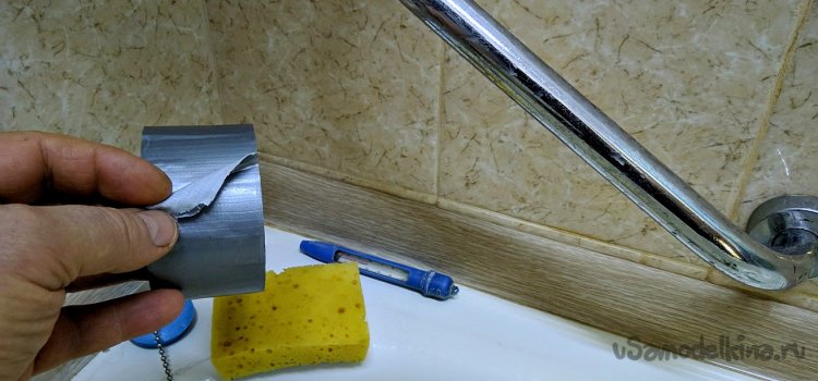 Лента клеящая с армированием, клеится на стык сразу и на ванну и на стену, исключает подтекание в случае неполного прилегания плинтуса в швах между кафелем.