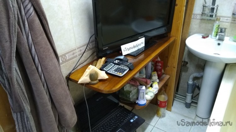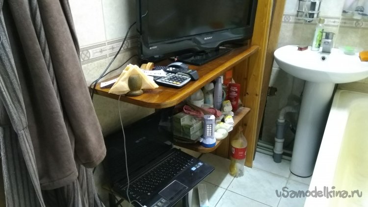 Да, я установил там телевизор, 32 дюйма, 70 х 40 сантиметров, так понятнее нежели в буржуинских дюймах или как принято у торгованов-маркетологов измерять по диагонали. Ну и зачем нам их диагонали и дюймы? Да просто голову задурить и впарить товар. Но я отвлёкся, обычный телевизор, и к нему ноутбук. Хоть телевизор и воспроизводит кучу форматов видео, но я не люблю ограничения, то ему флешку надо в FAT, то ему размер съёмного диска запредельного размера кажется, ну в общем с ноутбука легко и непринуждённо любой формат отправляется на просмотр. Ноутбук конечно тоже можно смотреть, но мелко и звук средненький, а тут все тридцать-три удовольствия )) С качественным звуком и изображением. В среднем на пару часов фильмы, мне такой режим очень даже подходит. Только зимой, когда на улице совсем холодно, могу и пару фильмов посмотреть. Спится, кстати, после такой ванны изумительно.