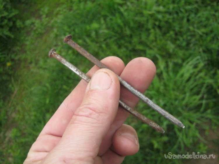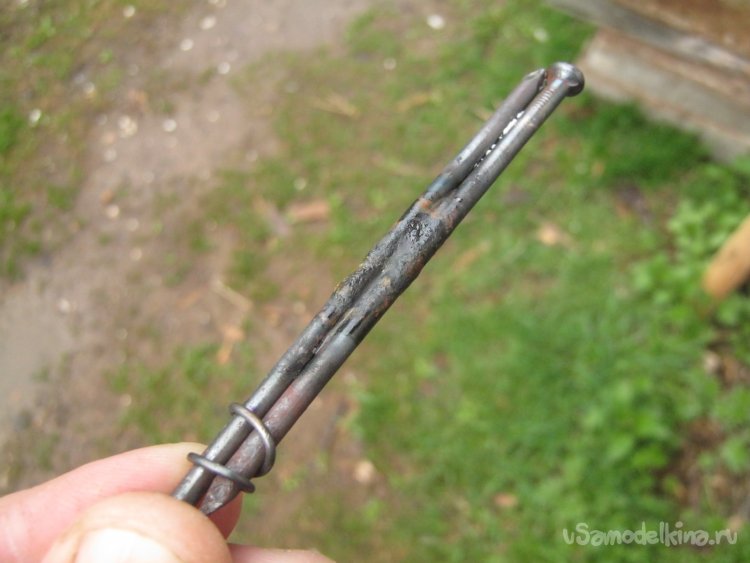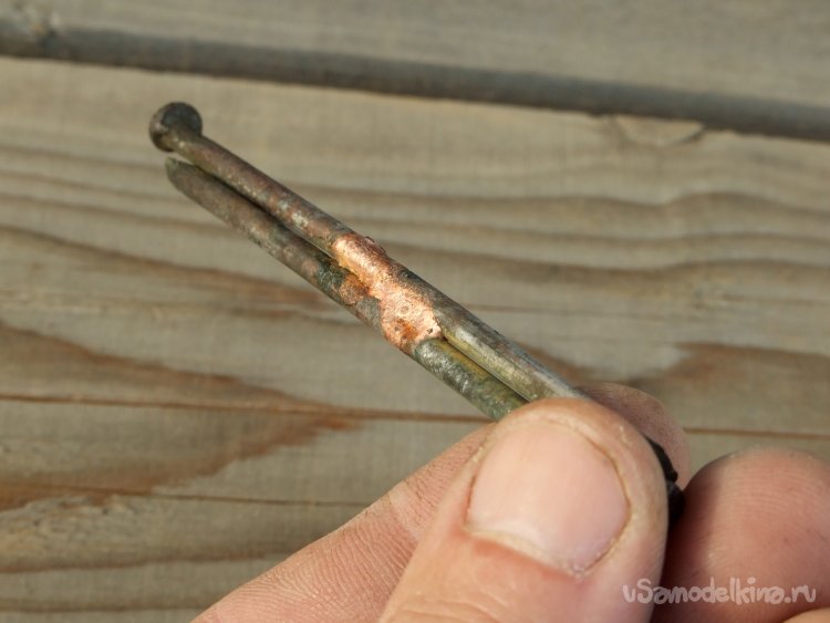 Располагая в мастерской электролизером с микрогорелкой, попробуем экспериментальную пайку латунью. Латунь возьмем от старорежимного разбитого мощного «автомата». Пациенты – попавшие под руку гвозди 100 мм. (Фото 2).