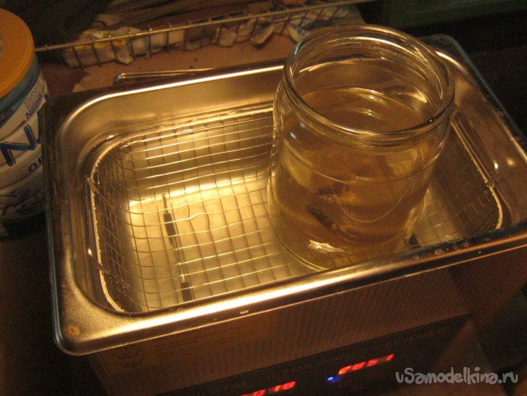 Фото 6. Стравливание остатков флюса в серной кислоте с применением УЗ мойки. Кислота, вероятно, более концентрированная, нежели рекомендуется. Замедлители травления для стали не применял.