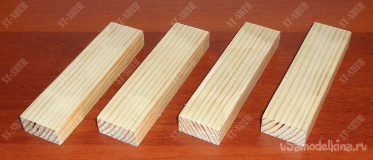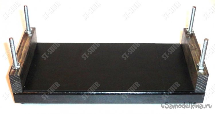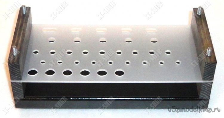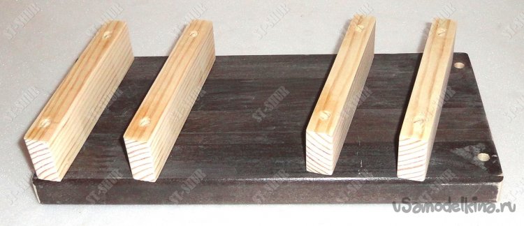 Боковые стойки вырезаны из обрезков реек и имеют размеры 114х30х15мм. В стойках и основании просверлены отверстия диаметром 6мм.