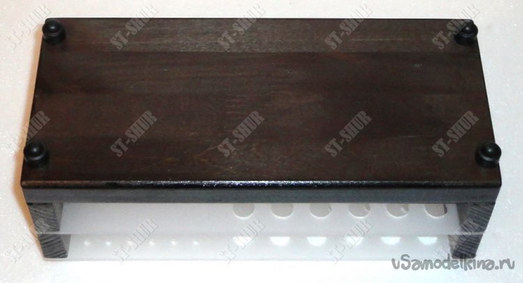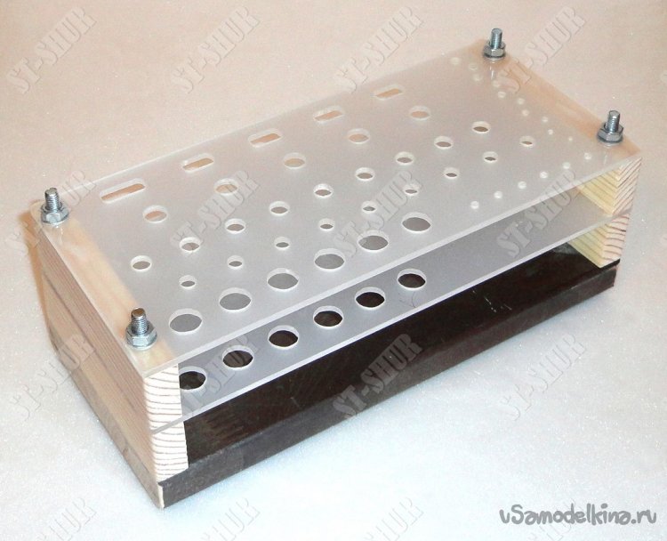 Деревянные детали конструкции обработаны быстросохнущим лаком «ХВ-784». С помощью двустороннего скотча на основание наклеены обрезки листовой резины.
