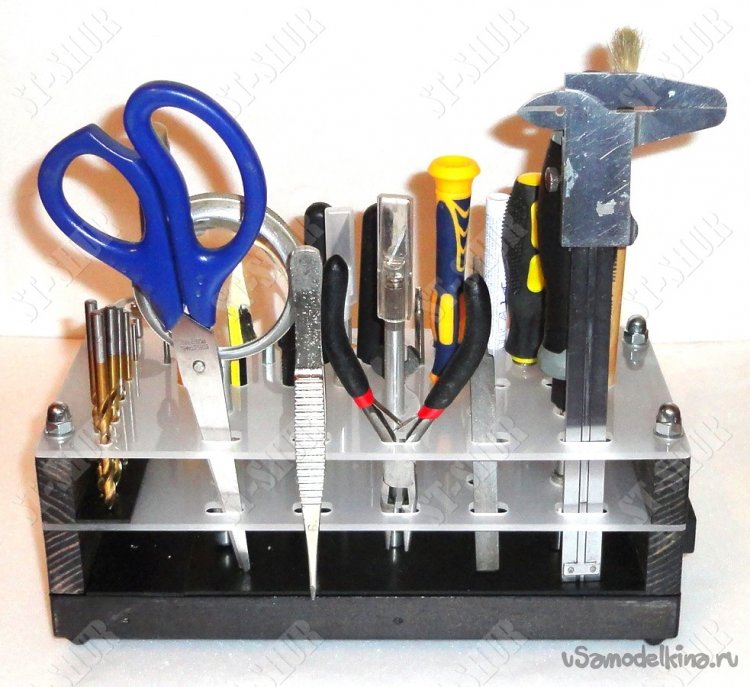 Идея состояла в быстром изготовлении достаточно устойчивой подставки-органайзера для различных инструментов, скапливающихся на столе в процессе работы. Целью была максимальная простота конструкции, возможность ее быстрой разборки для доработки (добавление дополнительных и изменение ранее изготовленных «посадочных» мест). А так же использование исключительно имевшихся в наличии обрезков материалов. Ну и конечно минимальные трудозатраты.