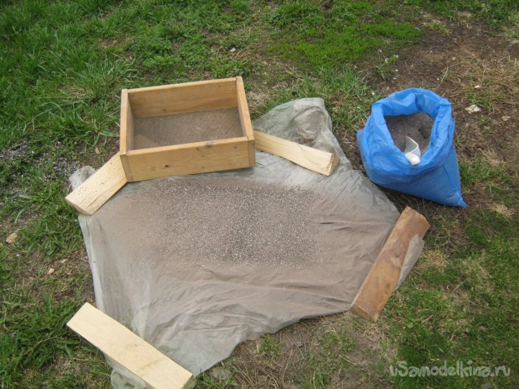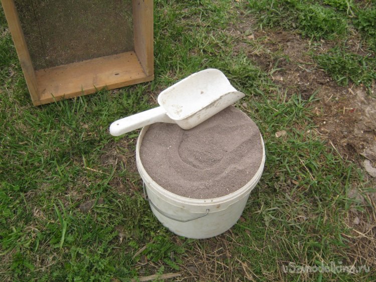 Первым делом просеиваем золу. Наша, из высокотемпературных топок банной и домашней печи, сжигающая все без остатка, тем не менее, содержит случайные угольки, спекшуюся землю приставшую к поленьям и т. п. Печи обычные, дают крупных остатков еще больше. Все это всплывающее добро отсеивается на мелком сите. Свою золу мы аккуратно собираем всю зиму, пакуем в мешки и составляем в бездействующей теплице или дровнике, на освобождающемся месте. Весной собранная зола мгновенно расходится при посадке и подкормке сада-огорода. Для просеивания мы нашли безветренное место и на небольшом куске пленки, в четыре руки, обработали около 4 кг. Взвешивали компактными подвесными электронными весами. Сито – стальная сетка с некрупной (около 3 мм) ячейкой, привинченная саморезами с широкими шляпками к дощатому ящику вместо дна (Фото 2).