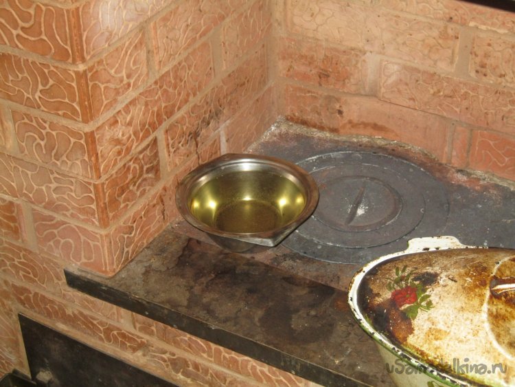 Приготовленным крутым кипятком мы залили кило просеянной золы, добавили отвешенную порцию извести. Несколько раз перемешали варево деревянным веслом, закрыли крышкой и поставили на горячую, топленую по случаю прохладной погоды, печь в мастерской (Фото 5).