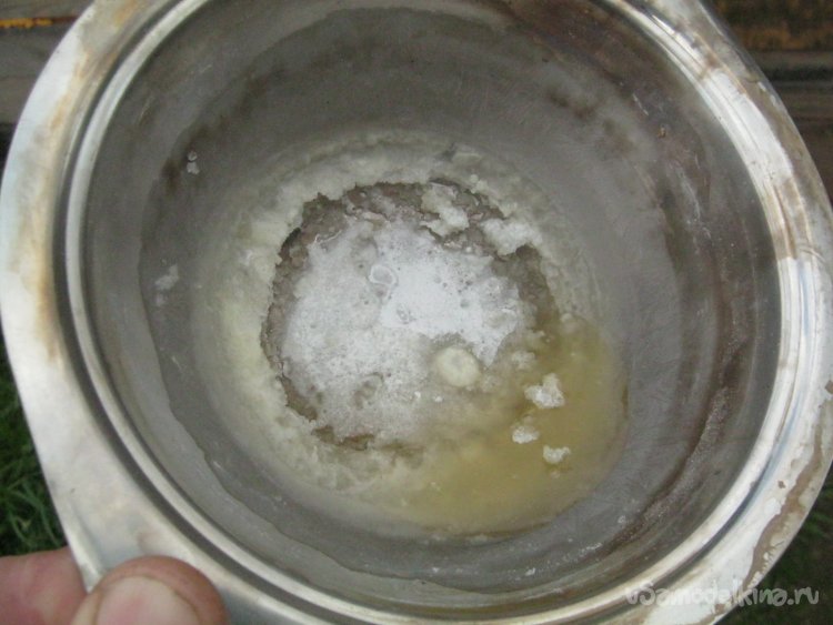Подобрав посудину поменьше, слили в нее полученное и довели до кипения на той же уличной печи. Залили последний килограмм просеянной золы, добавили последнюю известь. Отстояли, слили в нержавеющую посудину для упаривания.