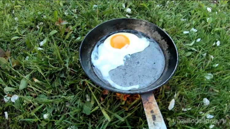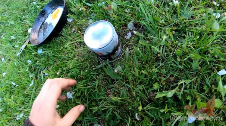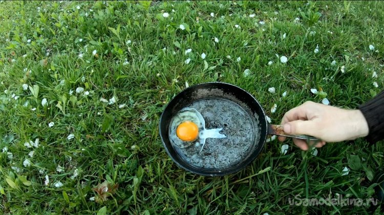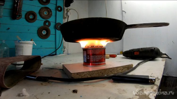 Под сковородой фокусируется красивое желтое пламя и сковорода мгновенно разогревается.