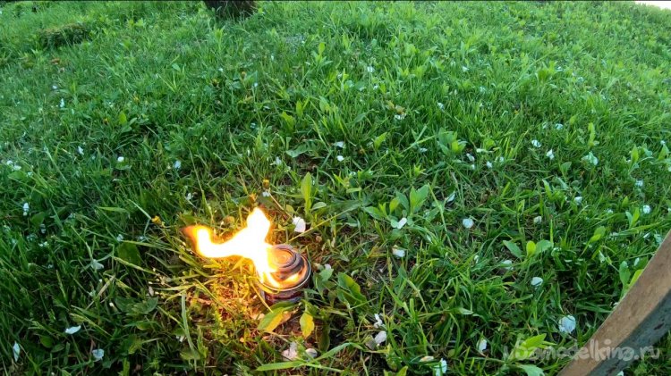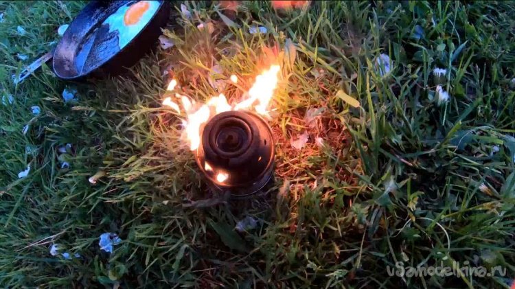 Ну что ж, идем в сад испытывать. Все работает отлично, конечно, ветер немного смещается пламя, так что хорошо бы оборудовать какой-то барьер, можно выкопать ямку, наложить кирпичей и так далее.
